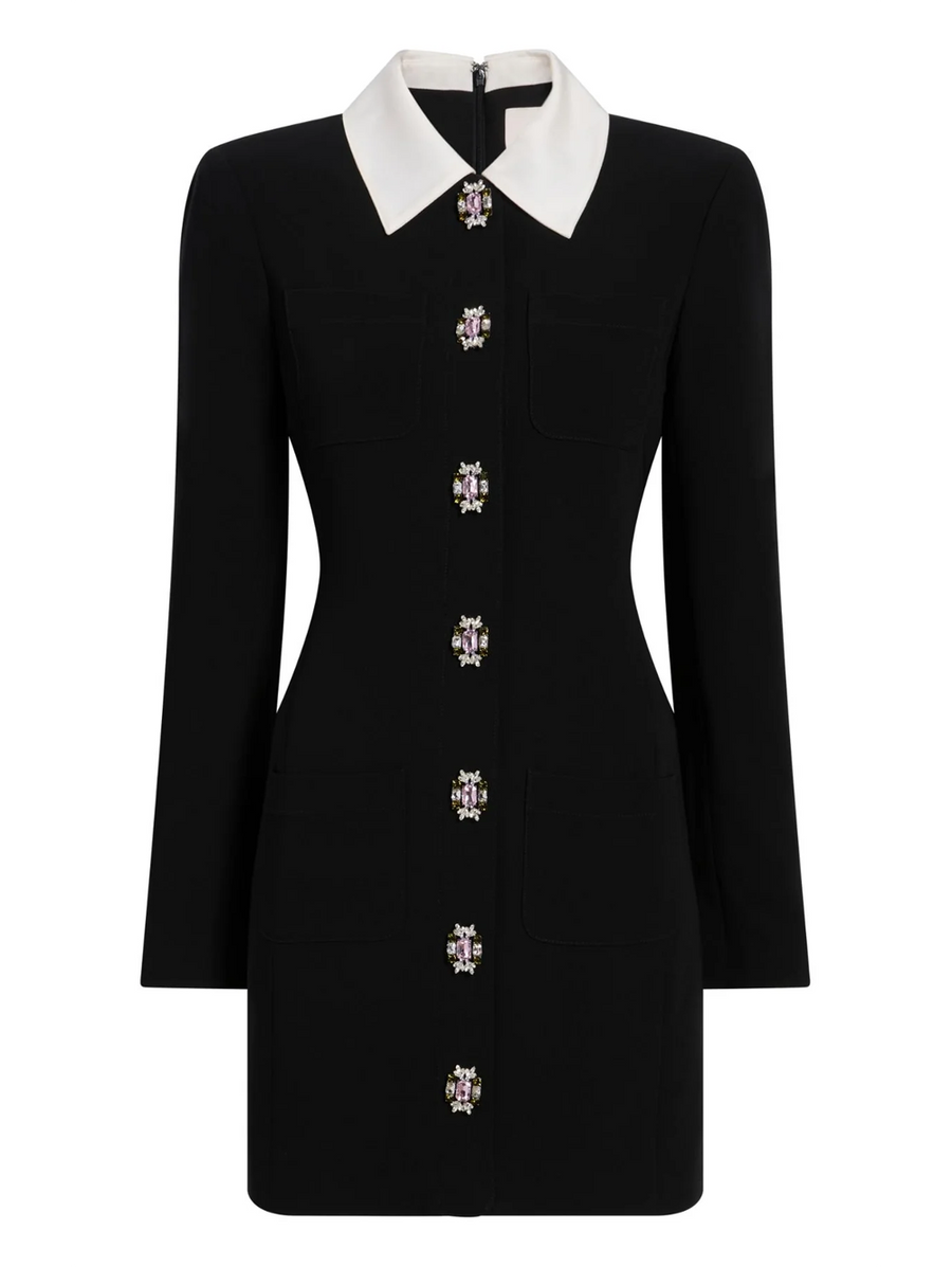 Amy Says... The Sheryl Dress blends professional elegance with modern style. Featuring long sleeves and a classic collared neckline, this mini dress is detailed with embellished buttons that add a refined touch. Perfect for the office or a chic event, it offers a flattering silhouette that balances sophistication and trendiness with ease. Shop Dresses.