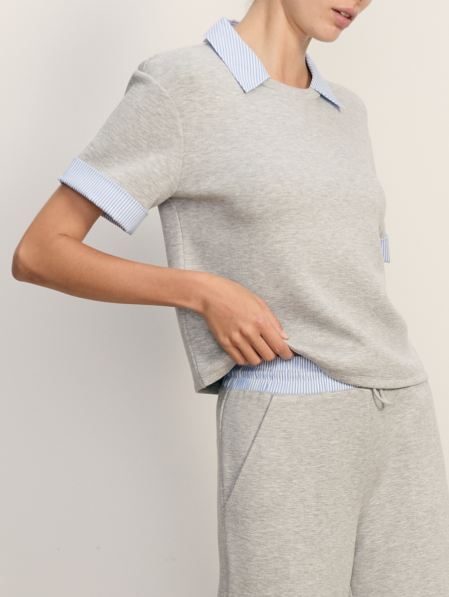 - Layered look with sweatshirt body, shirt-style cuffs and hem