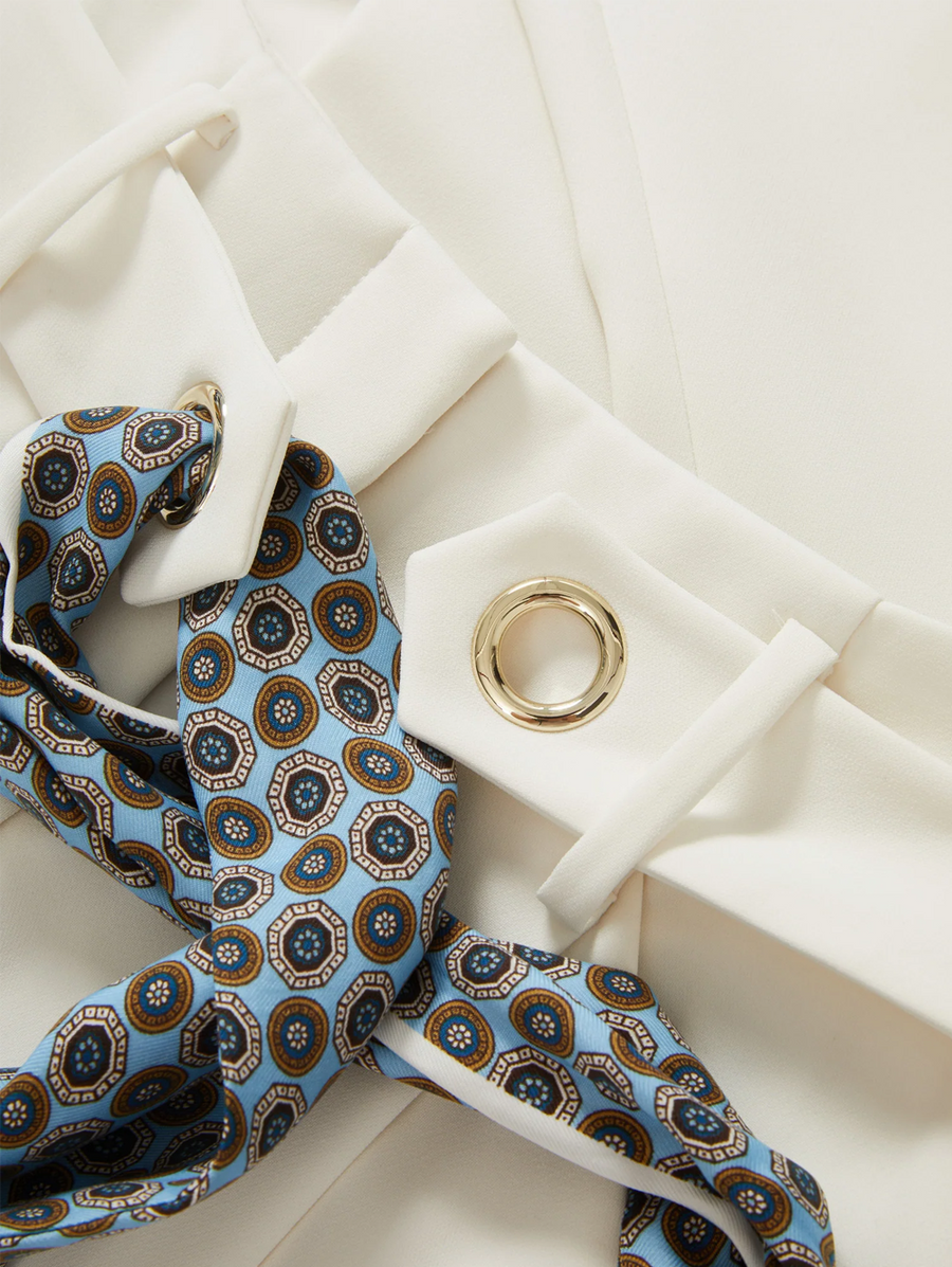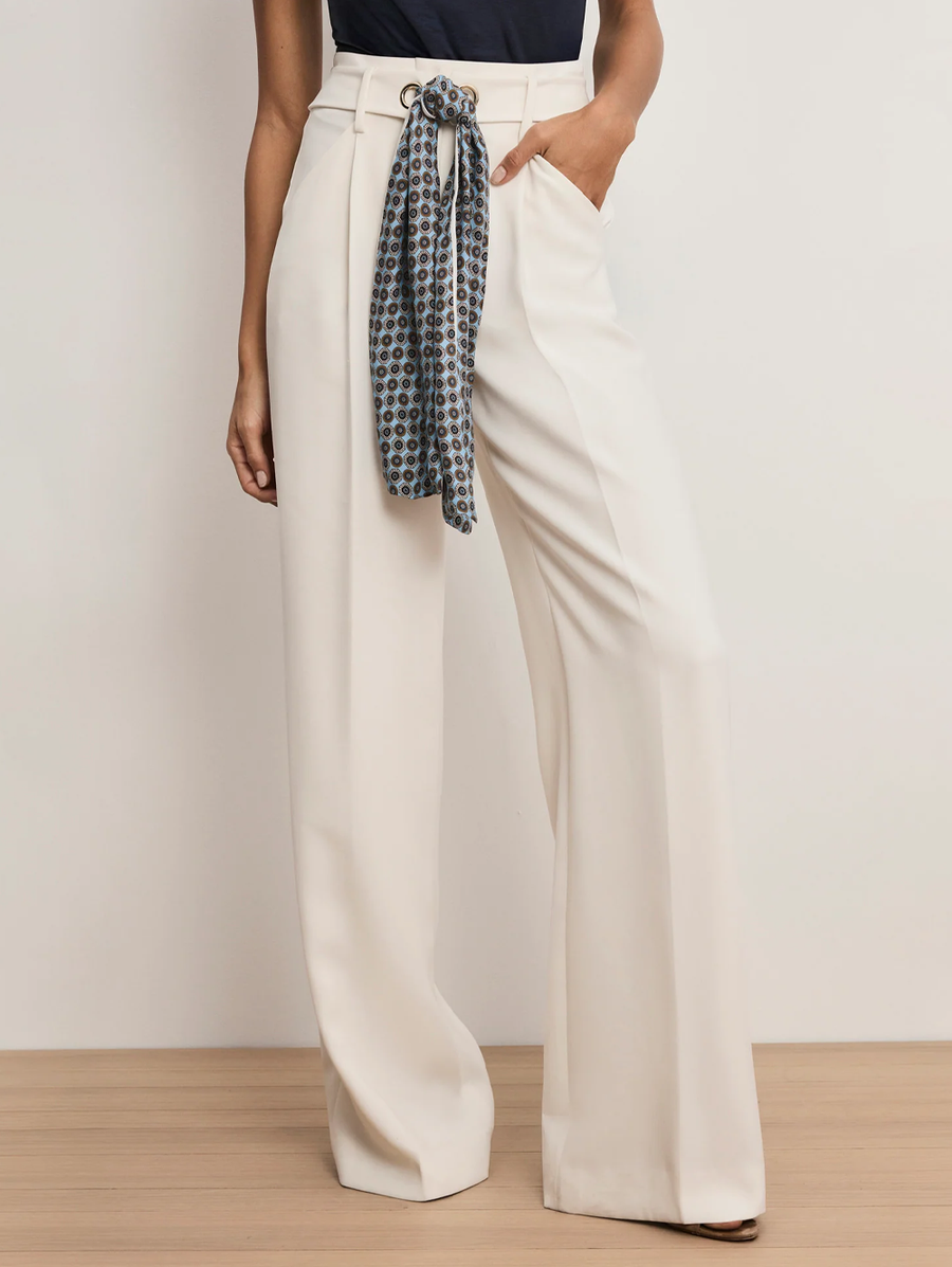 Amy Says... Crafted from luxe Japanese crepe, the Tai pant in off-white combines refined tailoring with fluid movement. Designed with a wide-leg silhouette and high Hollywood waistline, it features a removable tonal belt with metal grommets and a foulard scarf for styling versatility. Pair with a simple T-shirt and strappy heels to let the pants take center stage or complete the set for a work-ready vibe with the Cliffwood Cropped Vest. Shop Pants.