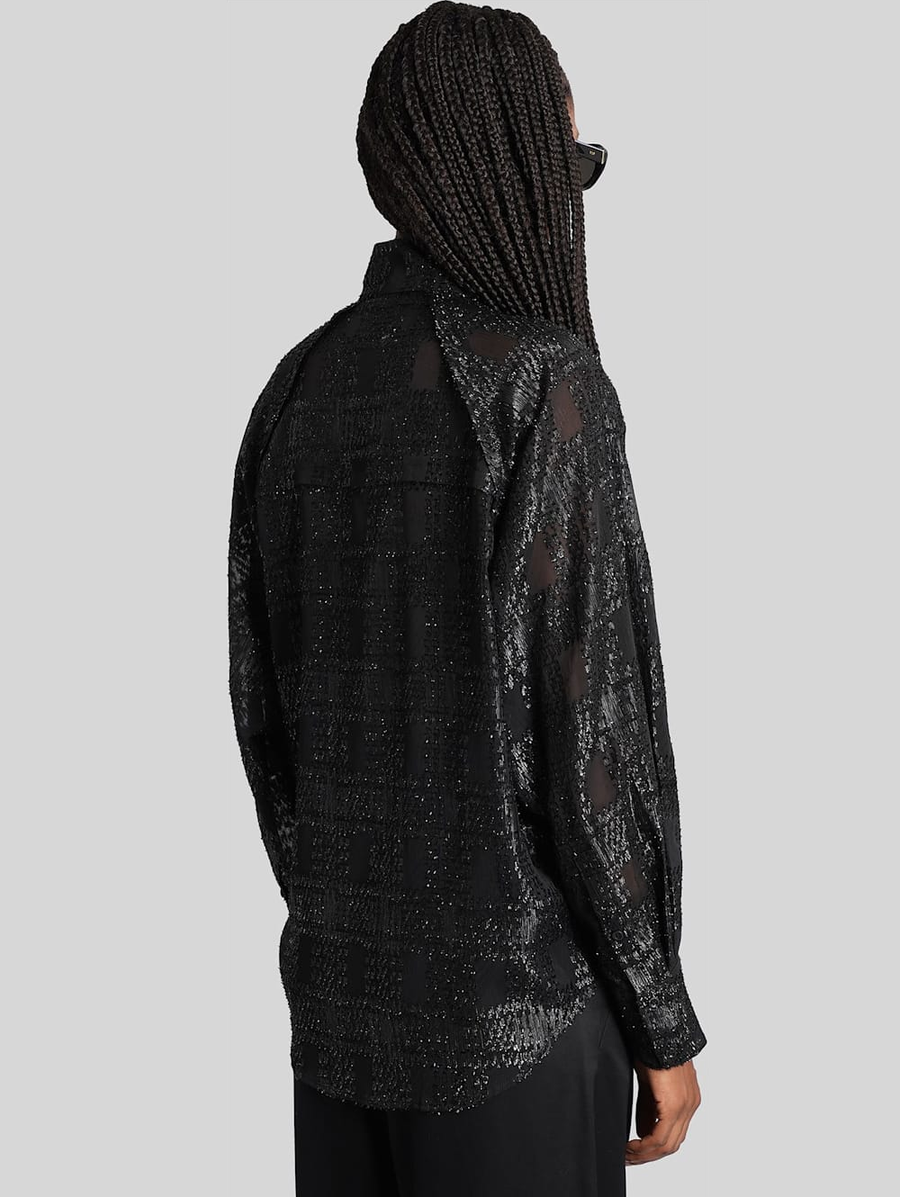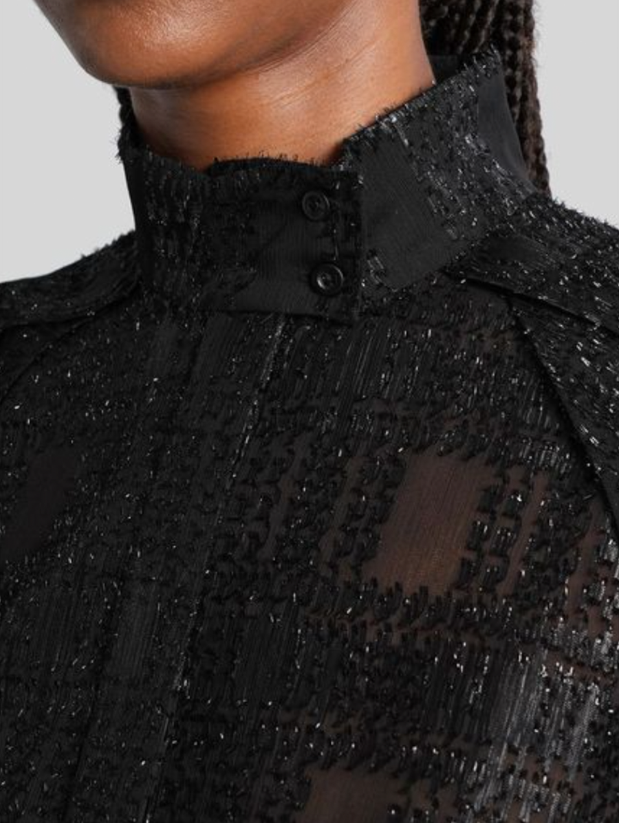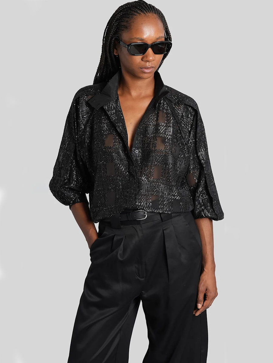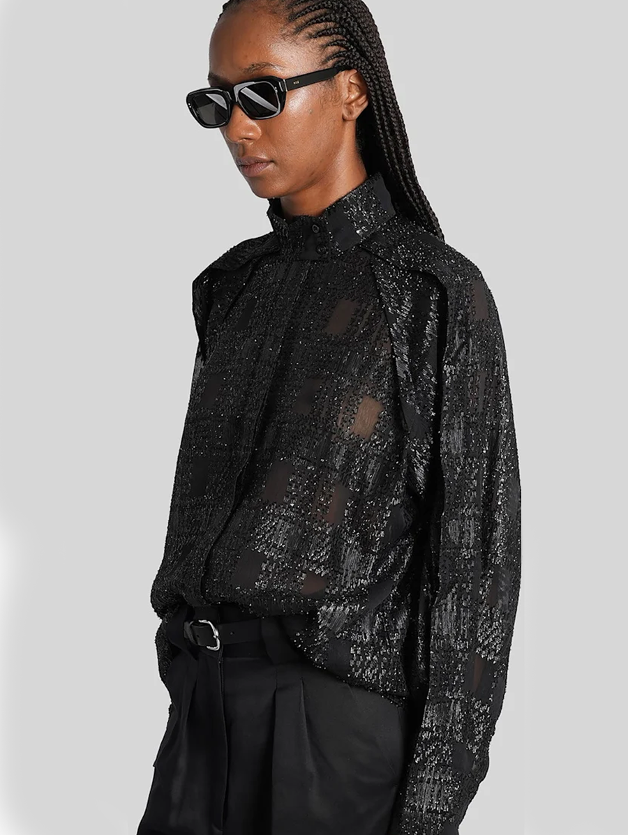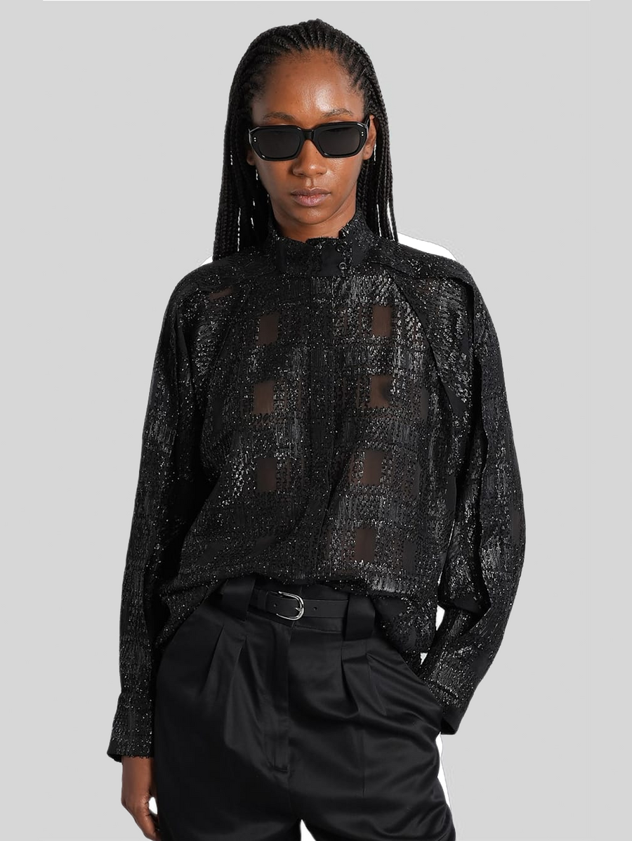 Amy Says... The Valmu Shirt is crafted in black polyester with a high collar, frontal buttoning, neck button, and tinsel, designed to catch the light and command attention. Featuring a high neck collar, its concealed placket and cuffed long sleeves finish the look, adding a tailored touch. Dress it down with denim—or go full glam with black trousers. Shop Blouses.