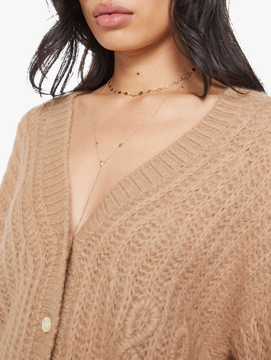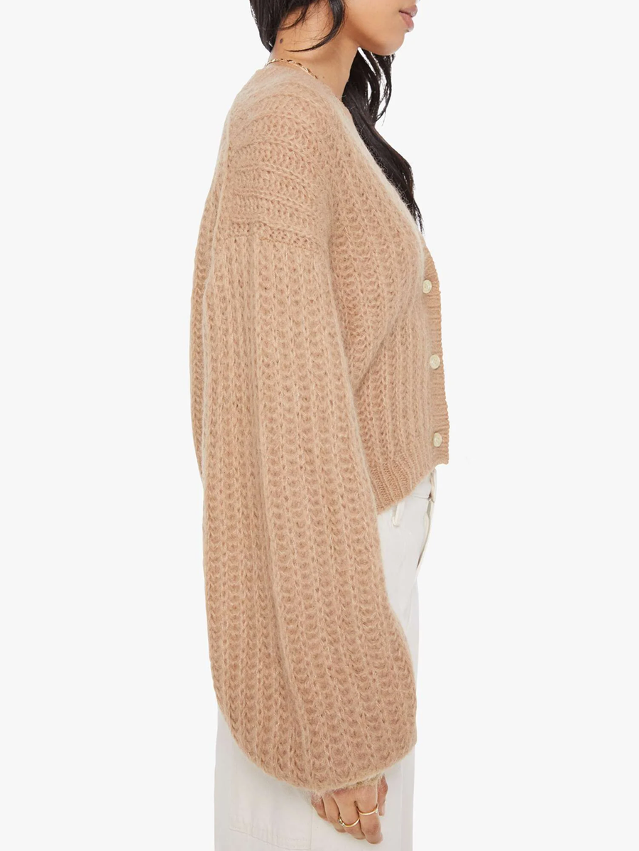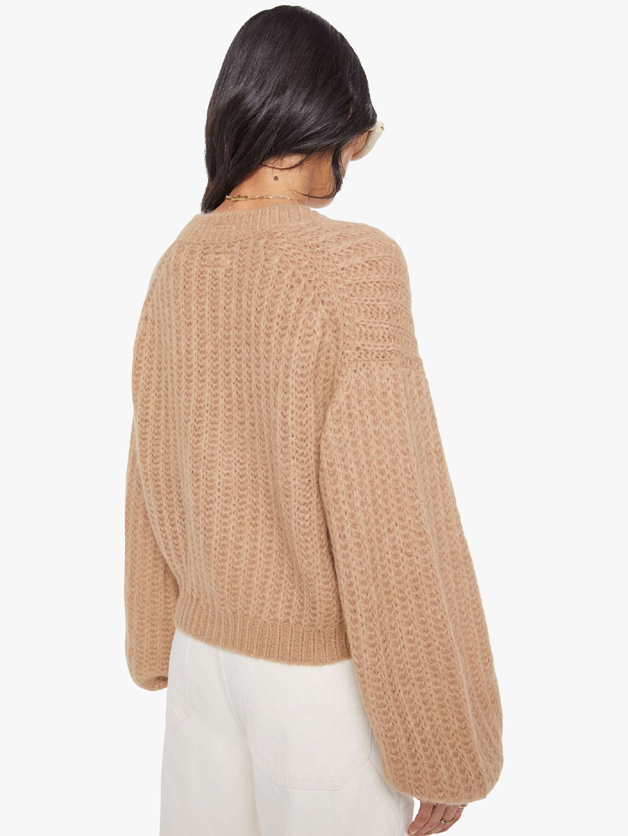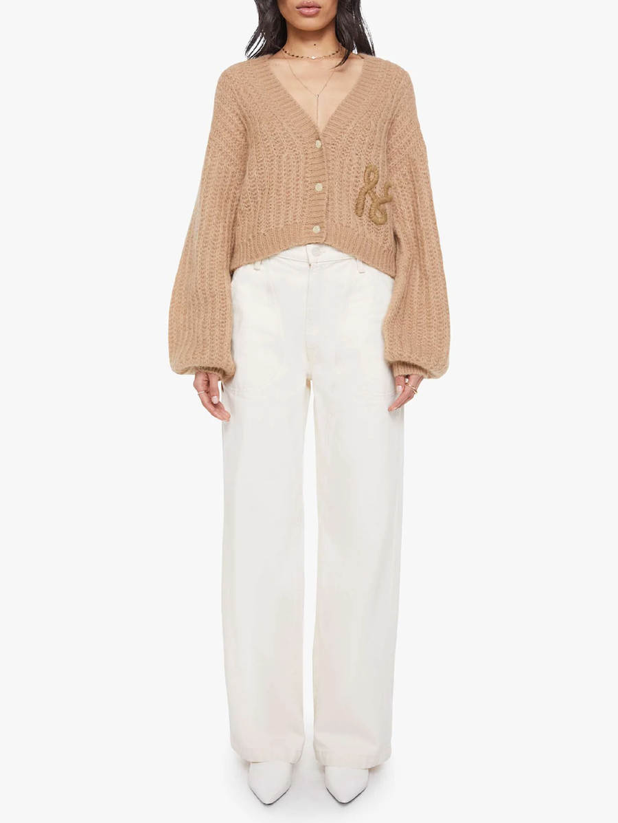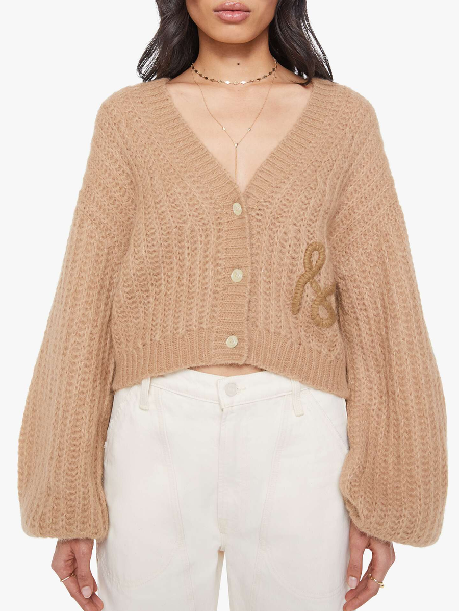 Amy Says... Sweet. A V-neck cardigan with drop shoulders, oversized balloon sleeves, ribbed hems and a cropped fit. Made from an alpaca blend in light khaki, Cotton Candy features knit details and an M embroidered on the hip. Shop Sweaters.