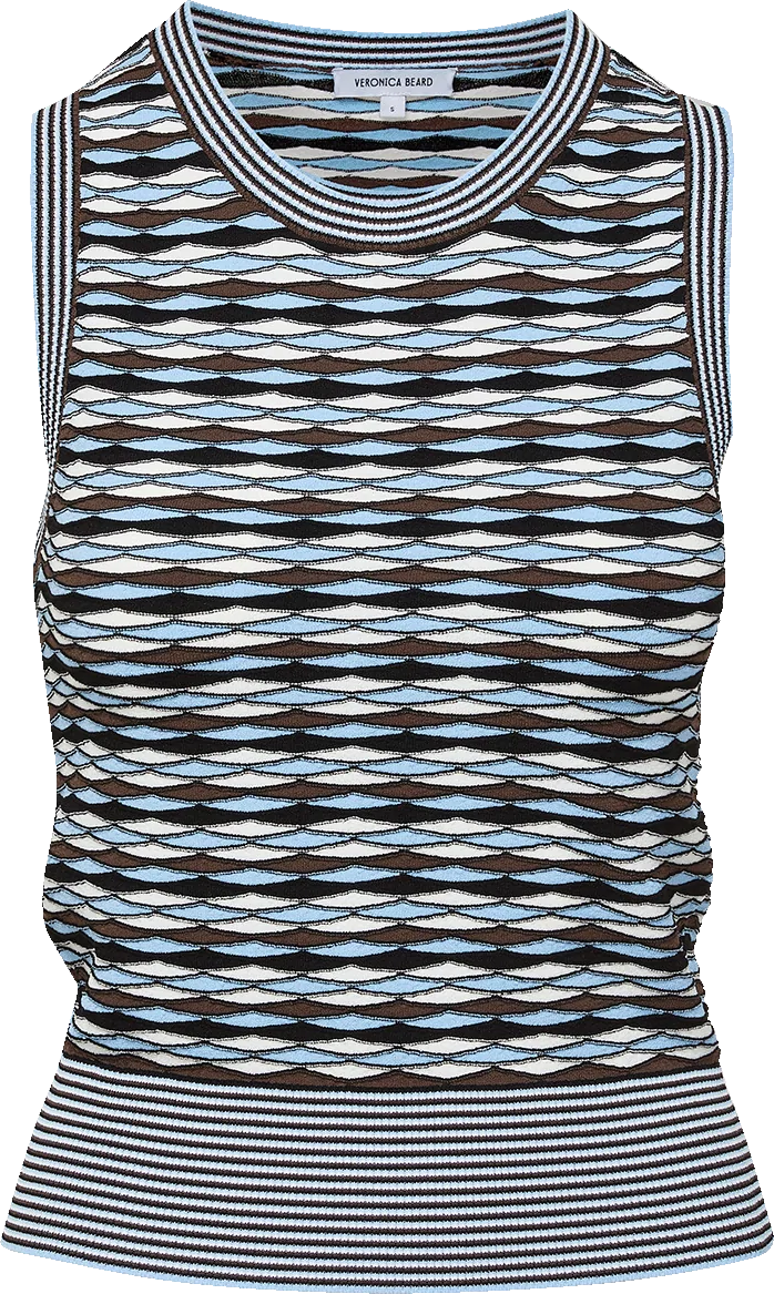 Amy Says... A fresh take on a favorite tank. Crafted from a premium stretch knit, the Jerrel sleeveless top features a blue ripple diamond jacquard pattern for a modern take on prep. Designed with a cropped silhouette and crew neckline, it’s finished with a striped trim and extra-wide hem for added dimension. Wear it solo or as a versatile layering piece with the coordinating Cambria Knit Cardigan. Shop Tops.
