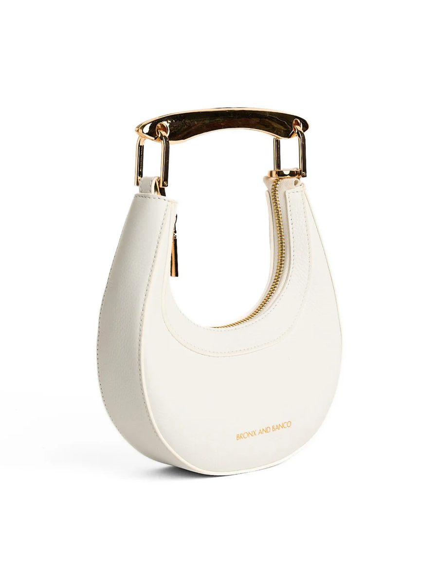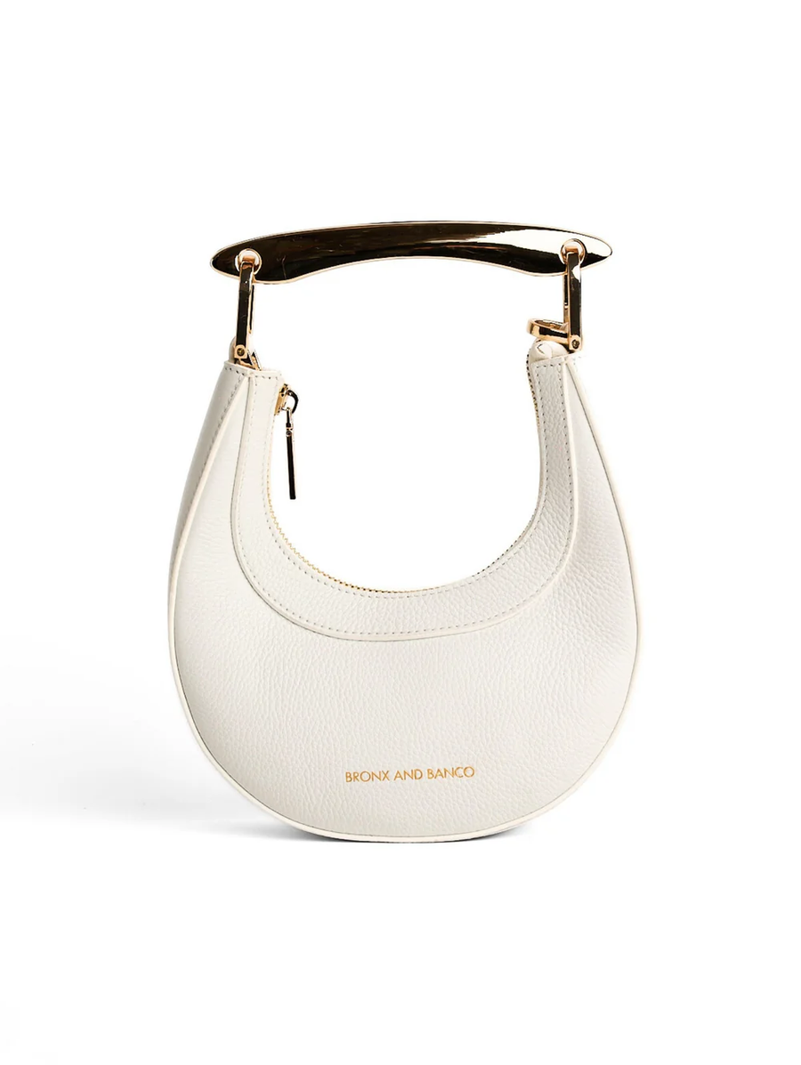 Amy Says... A chic, mini crescent silhouette handbag crafted in a classic white pebbled leather, featuring a polished brass top handle. It's the perfect finishing touch, from date night to luncheons. Shop Handbags.