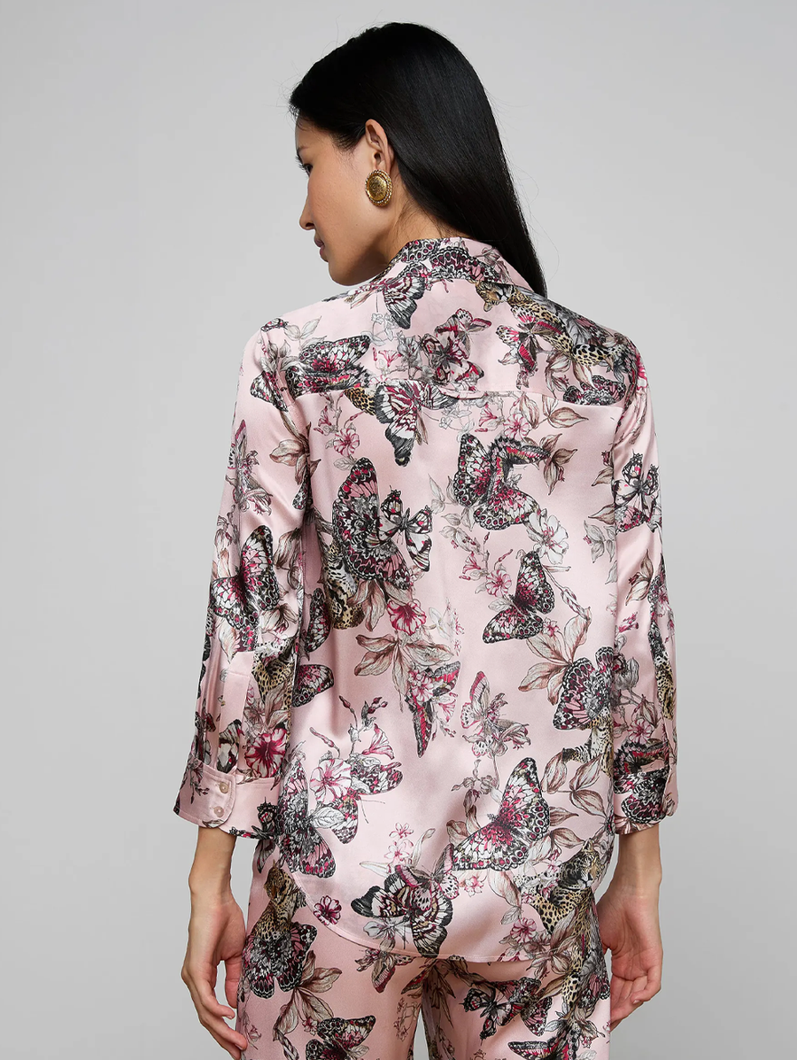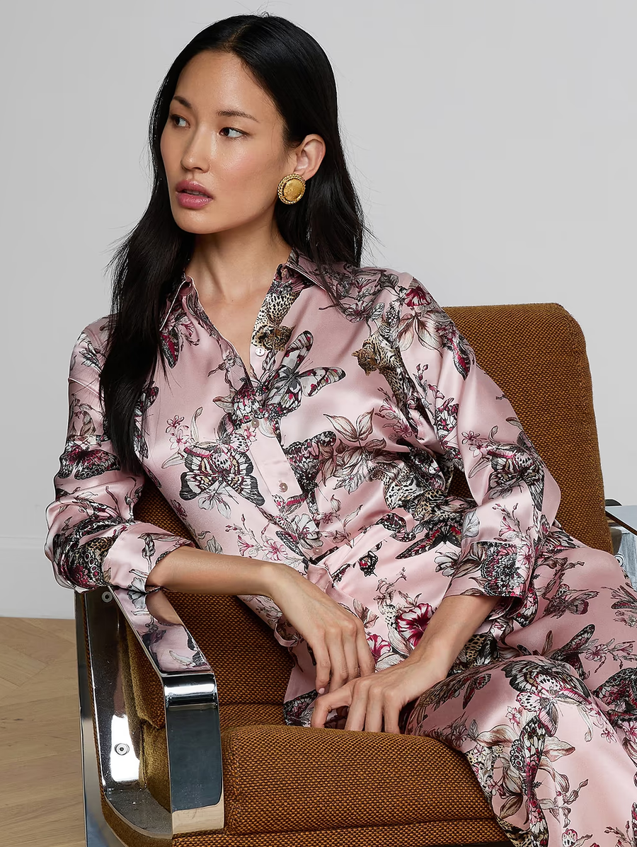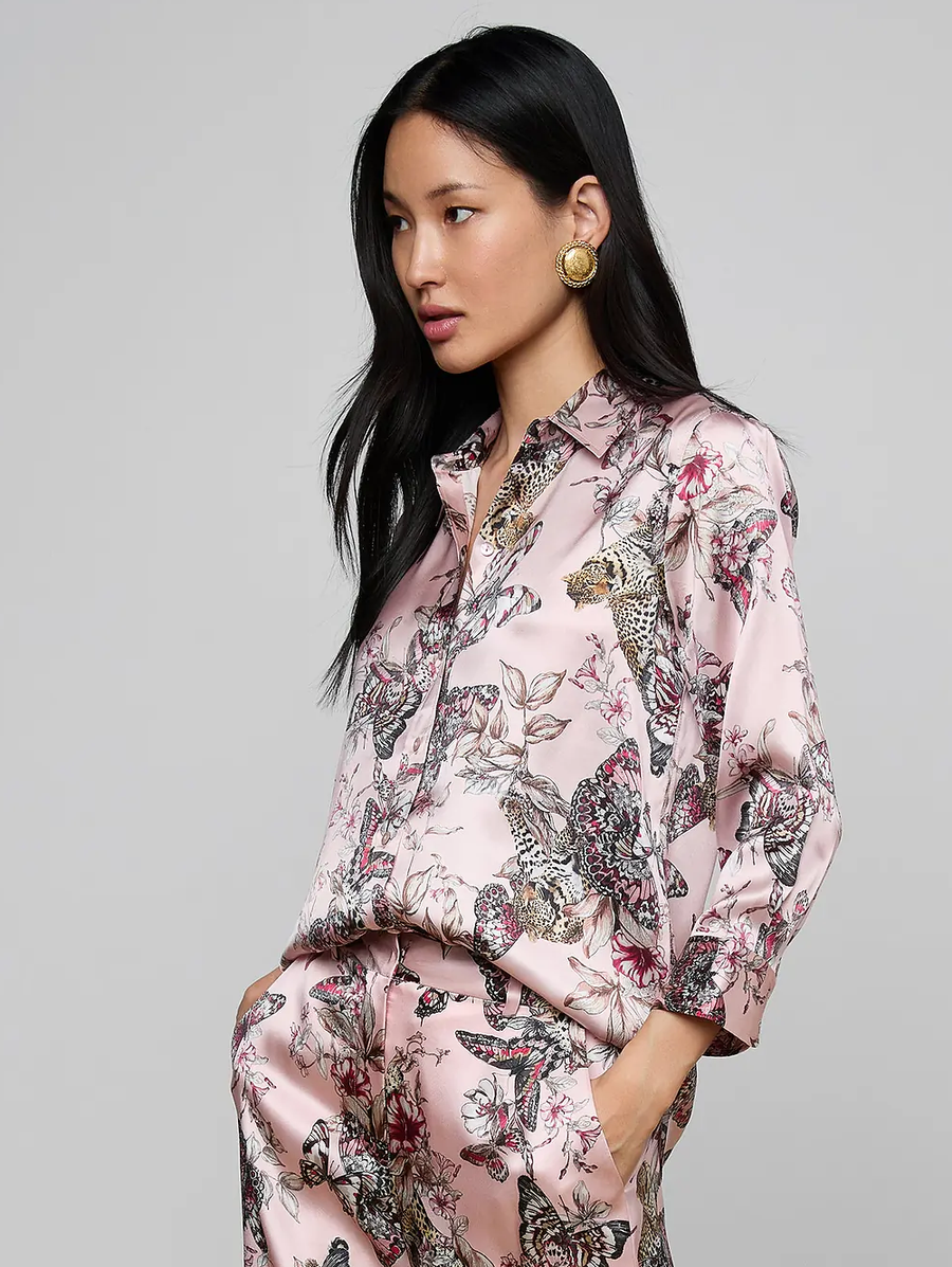 Amy Says... The iconic silk button-down that belongs in every wardrobe. This all-time bestseller is constructed with three-quarter length sleeves designed to perfectly showcase your jewelry—no sleeve rolling required. Our signature Dani blouse is back in light pink with a butterfly jungle print. Shop Blouses.