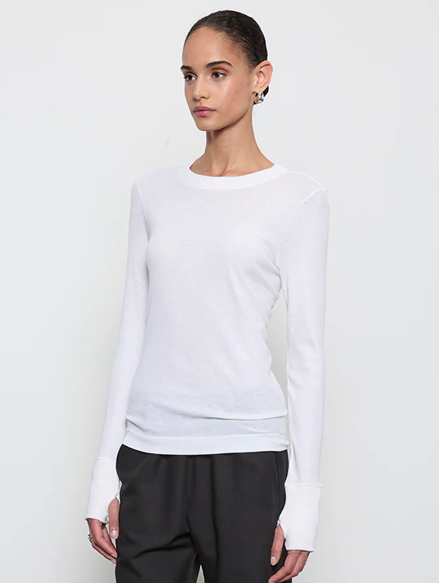 Amy Says... Long-sleeve top cut from the brand's soft cashmere jersey. With an easy fit with a crew neckline and thumbholes, this crisp white top perfect on its own or layered under blazers, cardigans, or knits. Shop Tops.