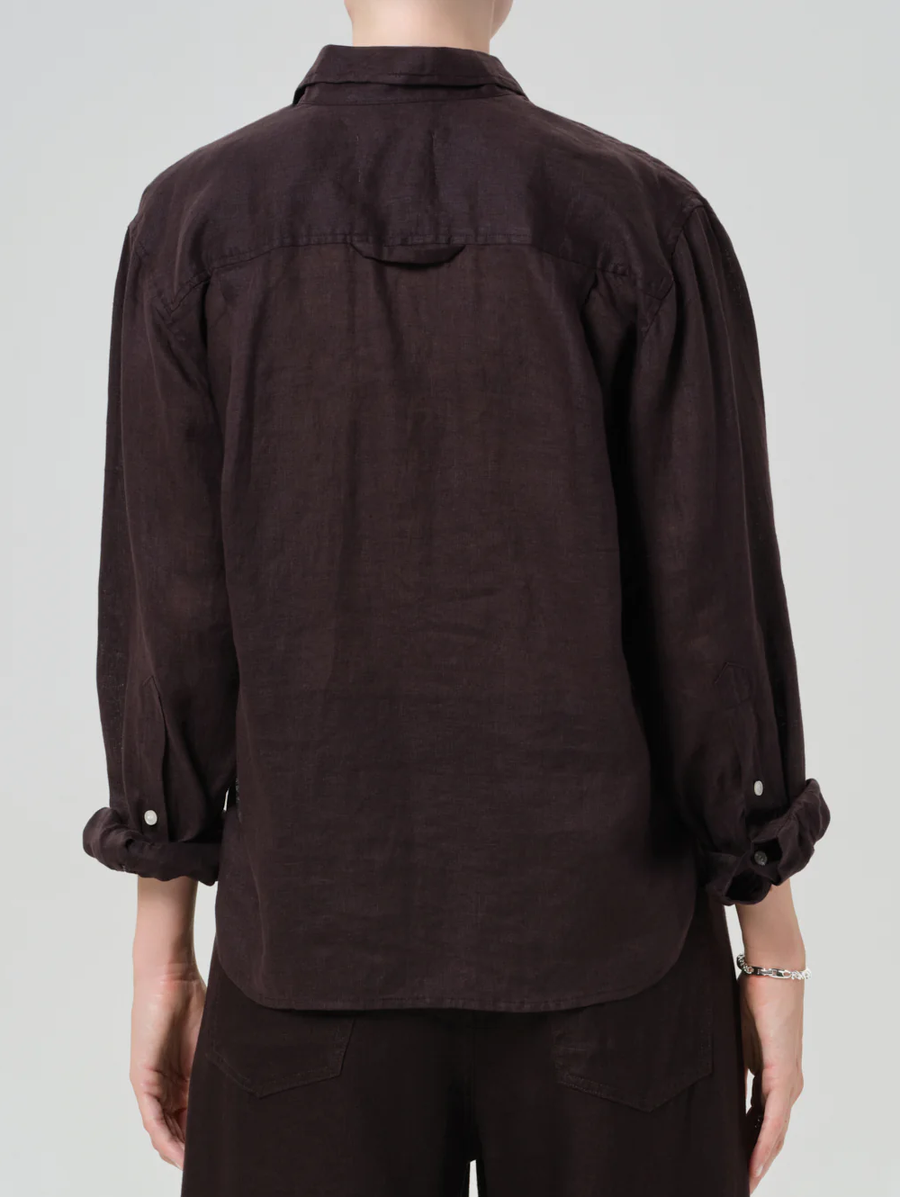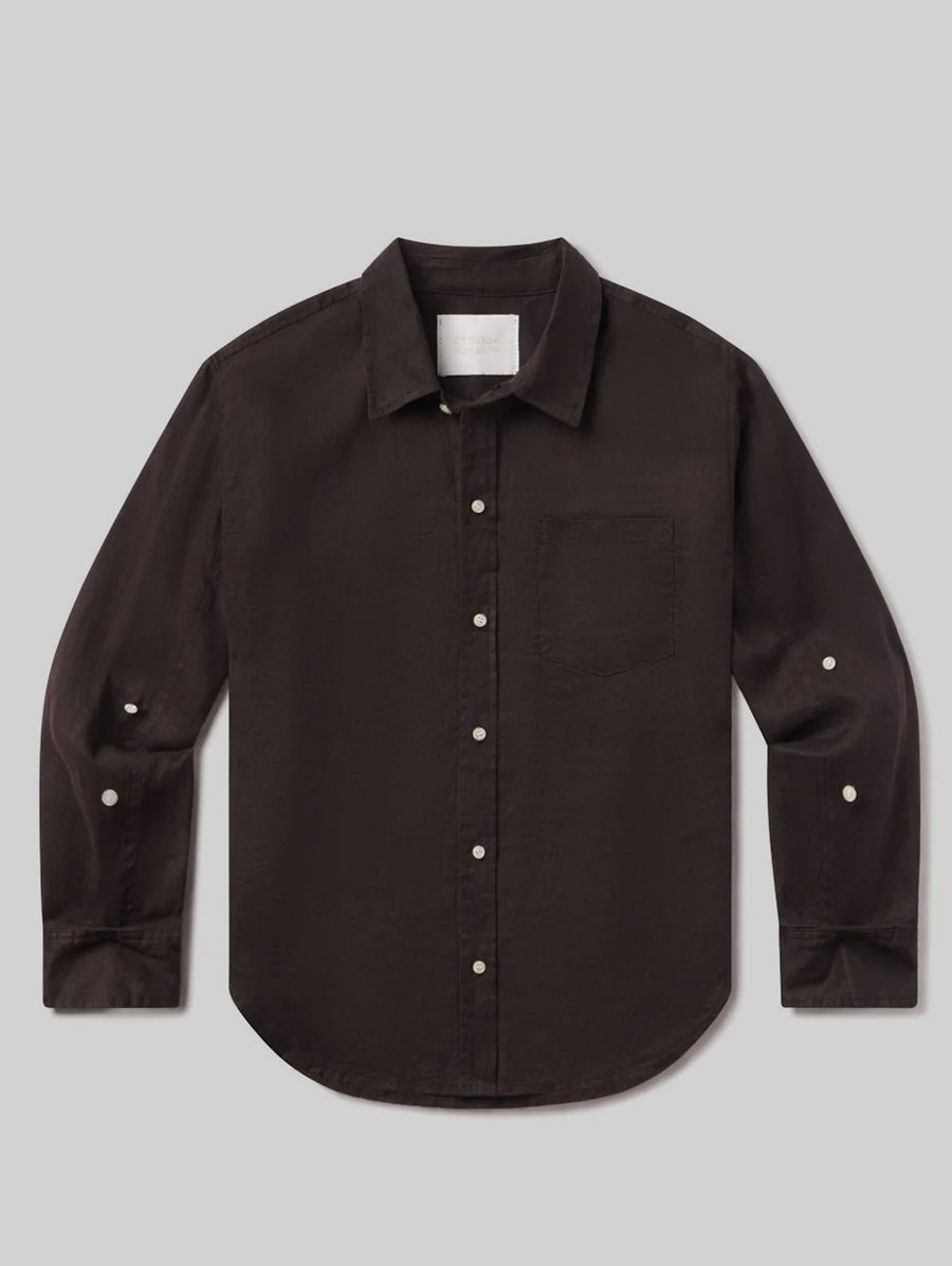 Amy Says... The Shrunken Kayla Shirt reimagines the classic button-down with a more tailored, cropped fit. Crafted from super lightweight linen, it’s ideal for layering over swim or pairing with your favorite travel pieces. The oversized silhouette is redefined with a high-low hem, adding a modern twist to this timeless staple. Versatile and effortlessly chic, it’s perfect for creating polished, laid-back looks year-round. Looks Like: Deep dark brown linen long sleeve collared button front shirt. Feels Like: Breathable lightweight linen. Shop Tops.