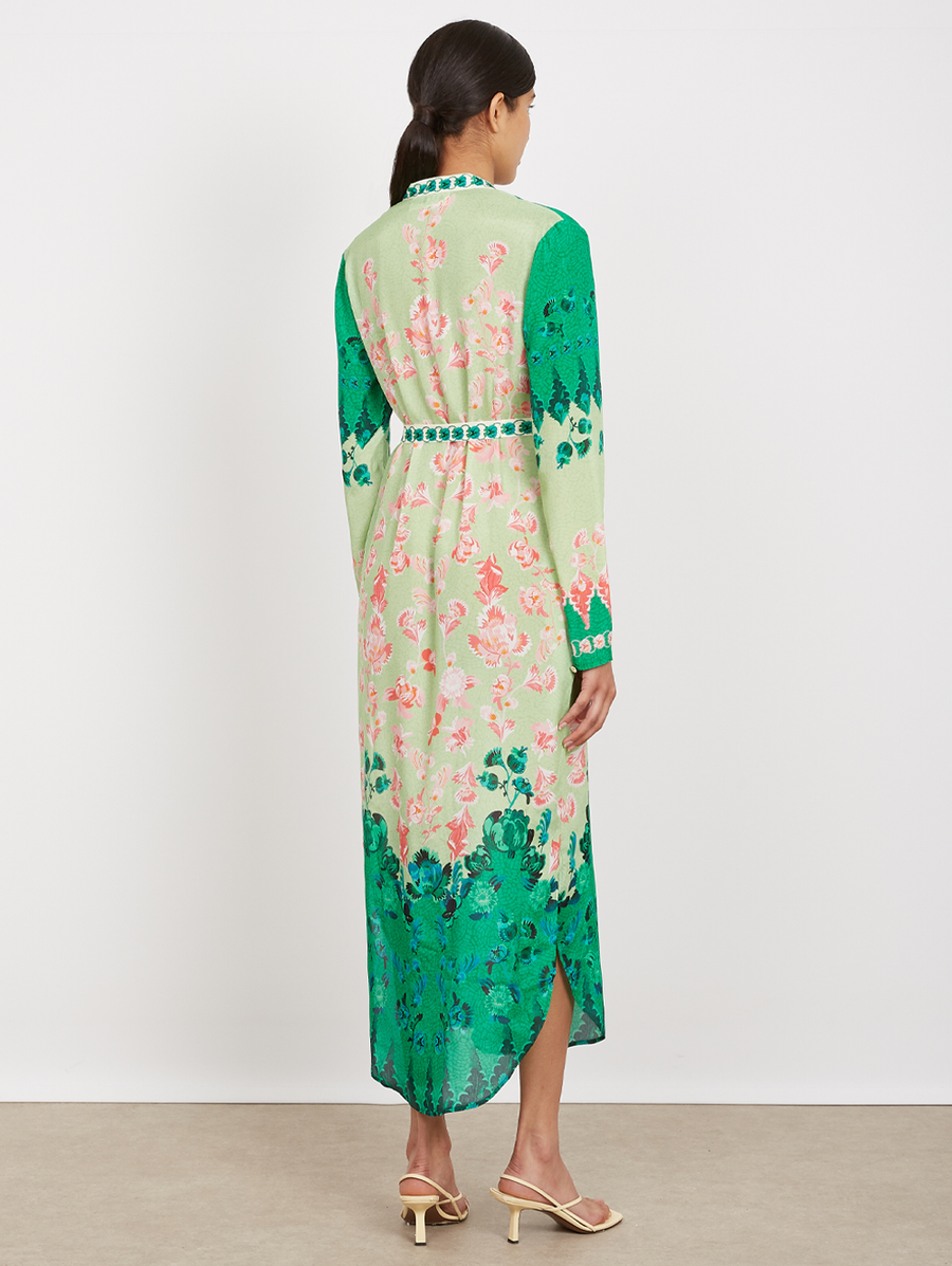Amy Says... The Molly-D Dress combines relaxed elegance with elevated details, making it a versatile wardrobe staple. With long sleeves, a tie waist, and button-front fastening, it offers comfort and a flattering silhouette. The custom print features a mosaic of lush and pale green decorated with a trail of soft flowers, creating a bold yet harmonious look for day or evening wear. Shop Dresses.