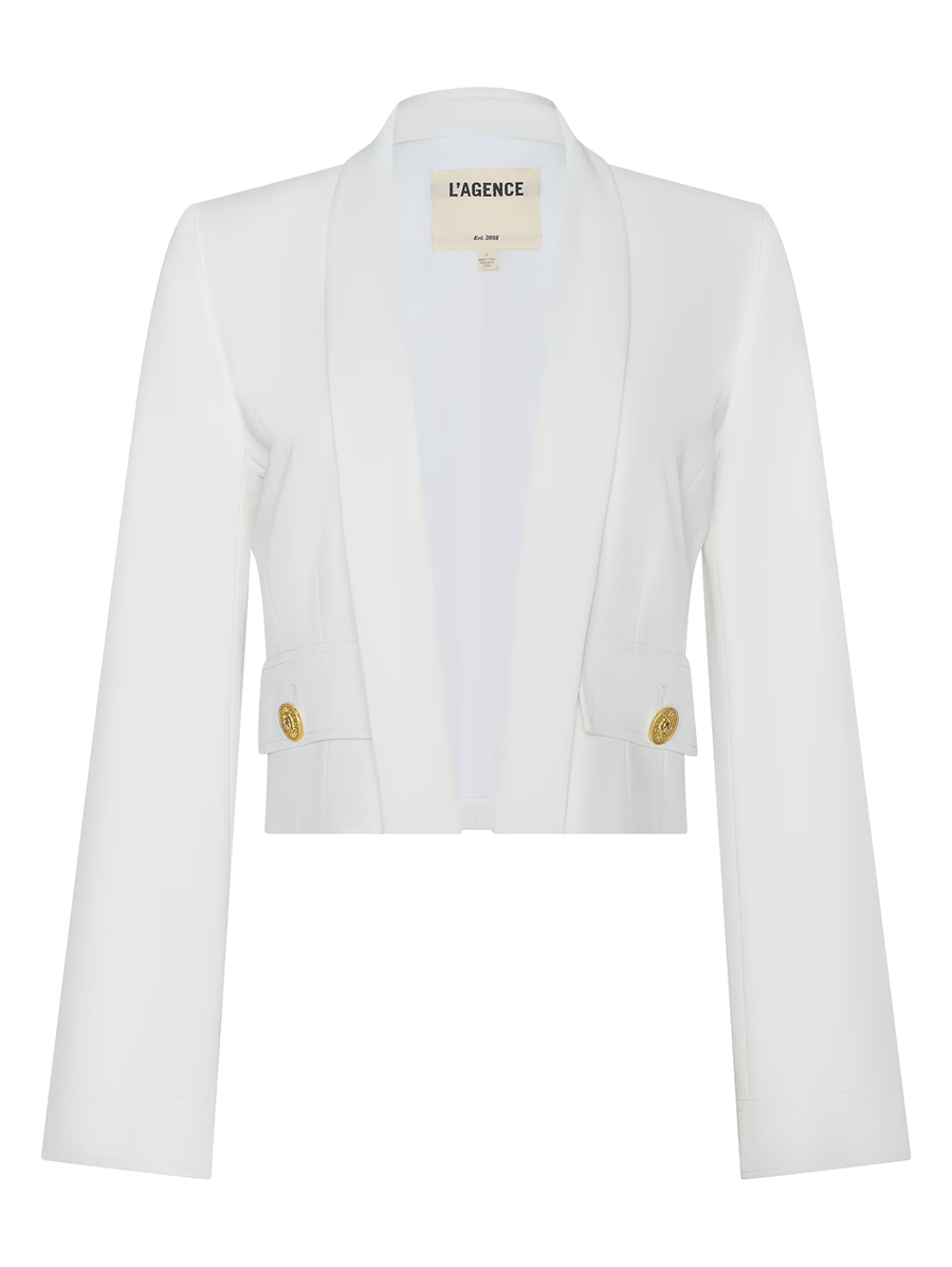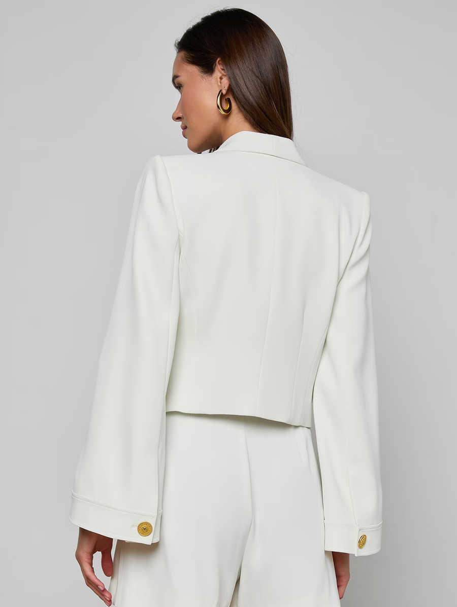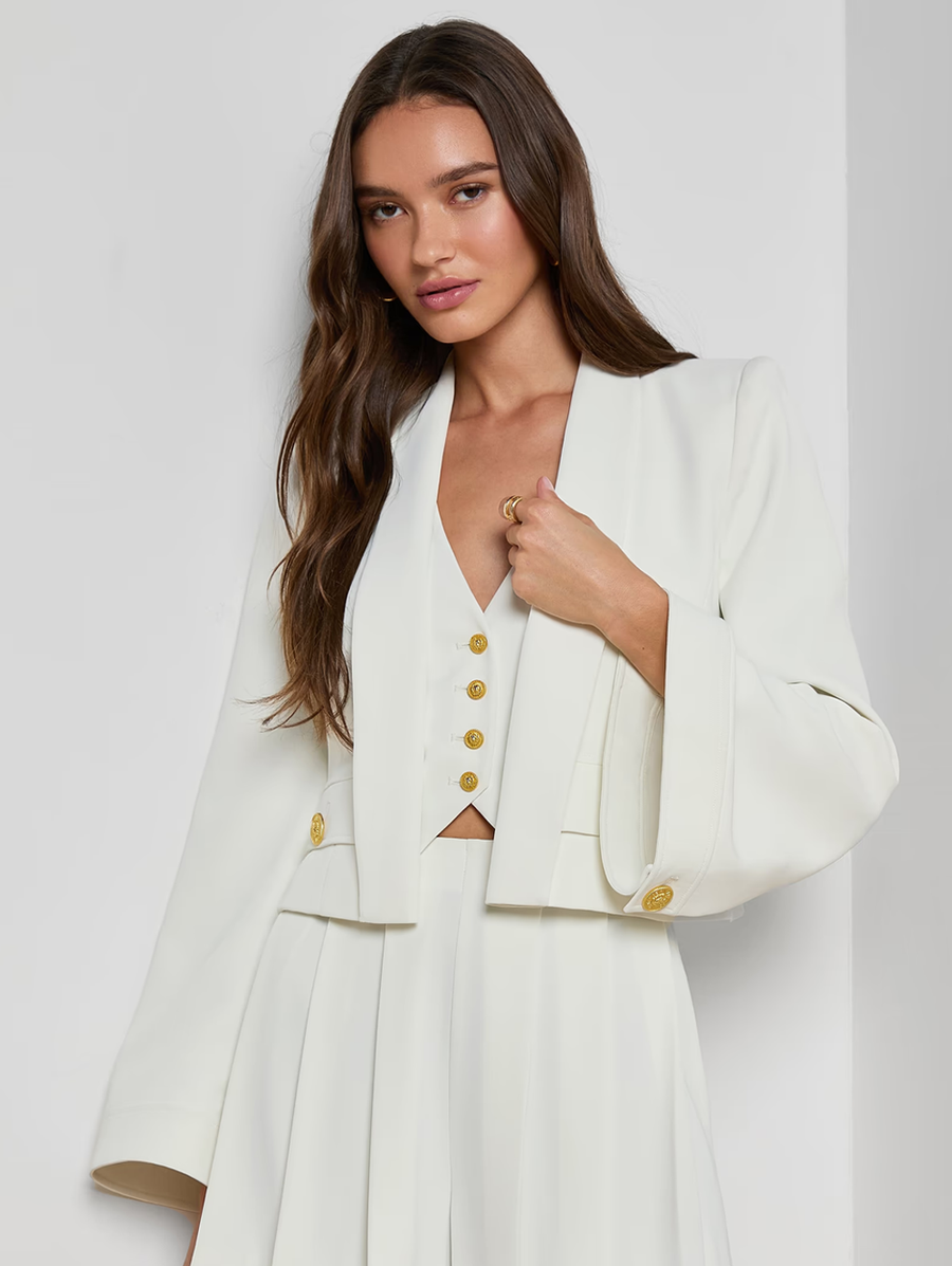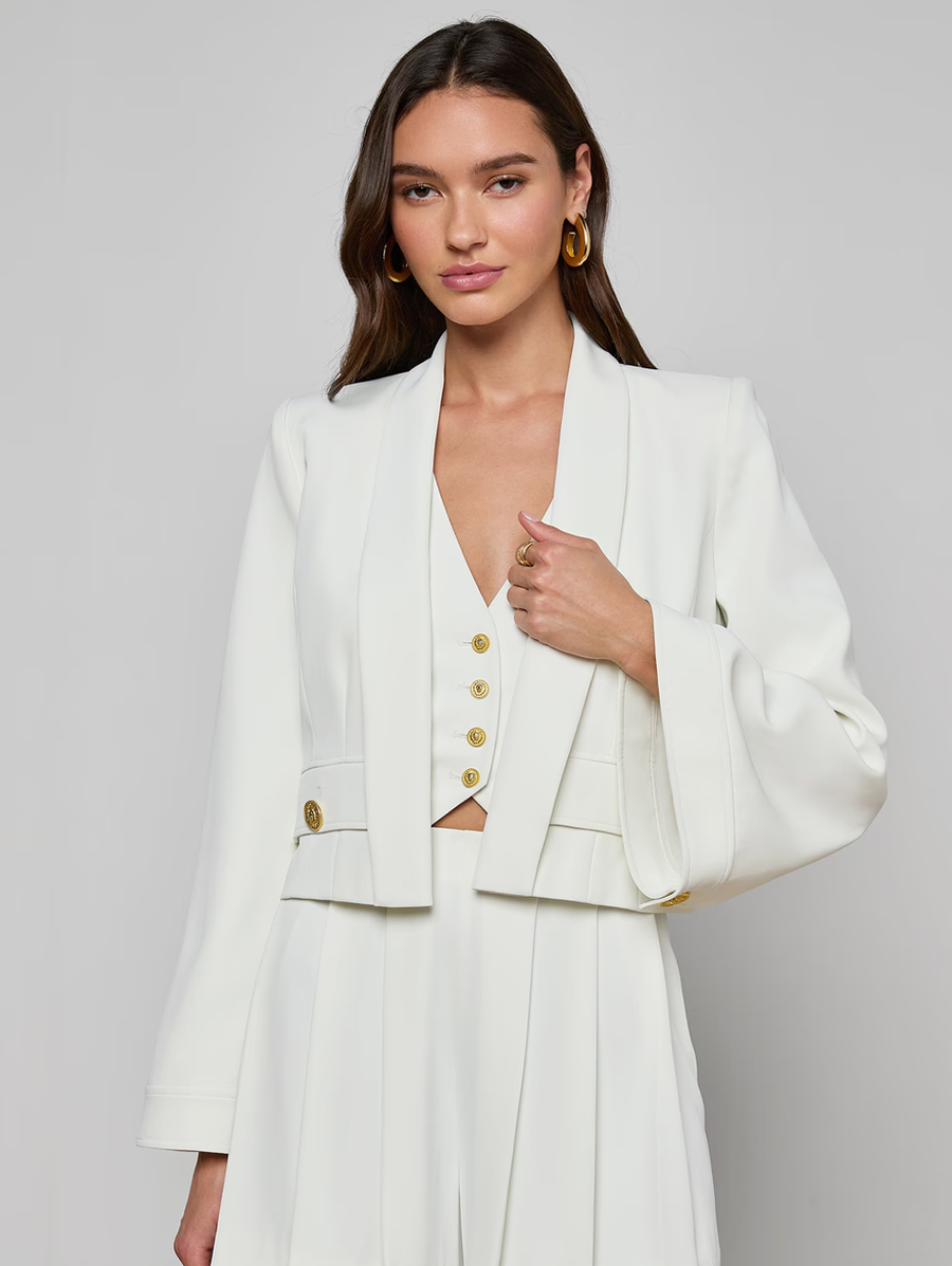 Amy Says... Easy, fresh, and impeccably modern. Designed with wide bell sleeves and an open-front silhouette, the Nixie melds the sharp tailoring of a blazer with the effortless throw-on-and-go feel of a cardigan, crafted from our fluid suit fabric for beautiful drape and feel. Complete the look with the coordinating Jianna Short Vest and Naamah Pleated Short. Shop Jackets.