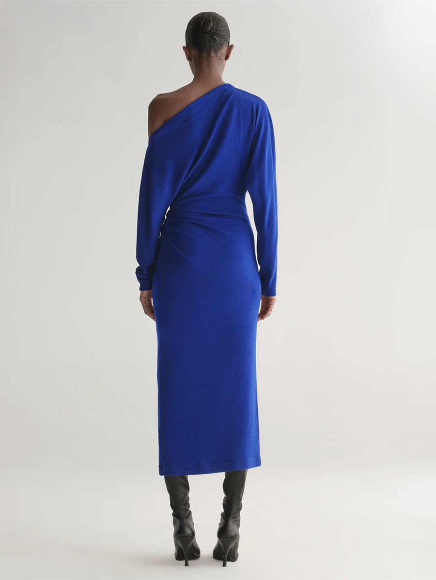 Amy Says... The Sonny Dress is crafted from soft wool jersey in a vibrant cobalt hue. This long-sleeve midi silhouette features an asymmetric neckline with one shoulder subtly draped off, balanced by rounded, sculpted shoulders. Gentle gathering through the bodice creates fluidity and shape, skimming the figure with ease. Shop Dresses.