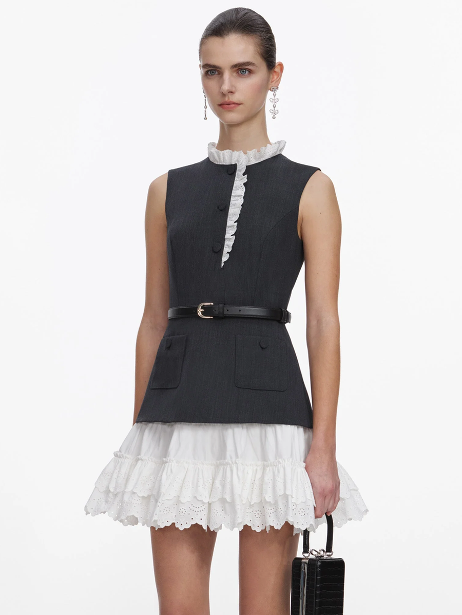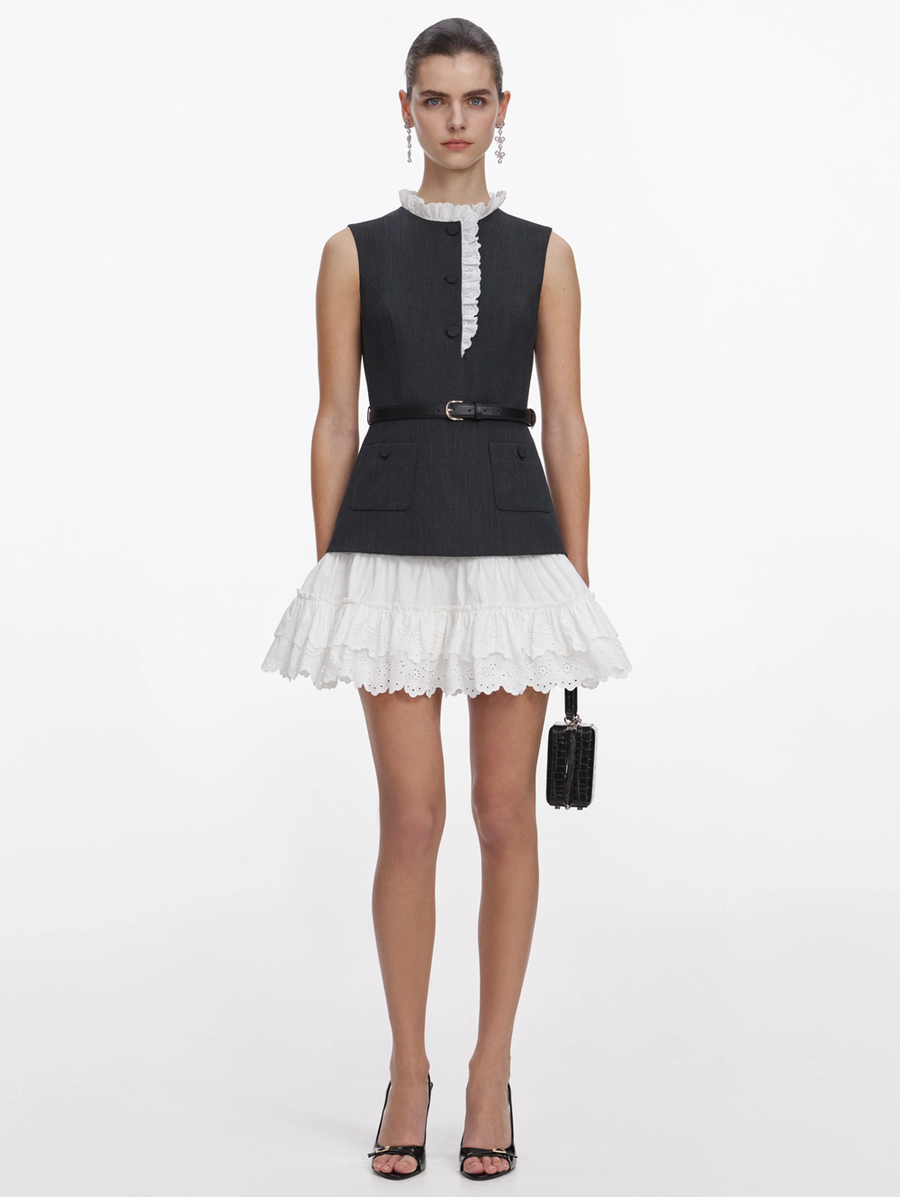 Amy Says... Tailoring with a romantic twist, broderie anglaise lends nostalgic charm to this wool mini dress. Ruffles accent the contrast trim neckline and full flared skirt – ideal with flats and heels alike. Shop Dresses.