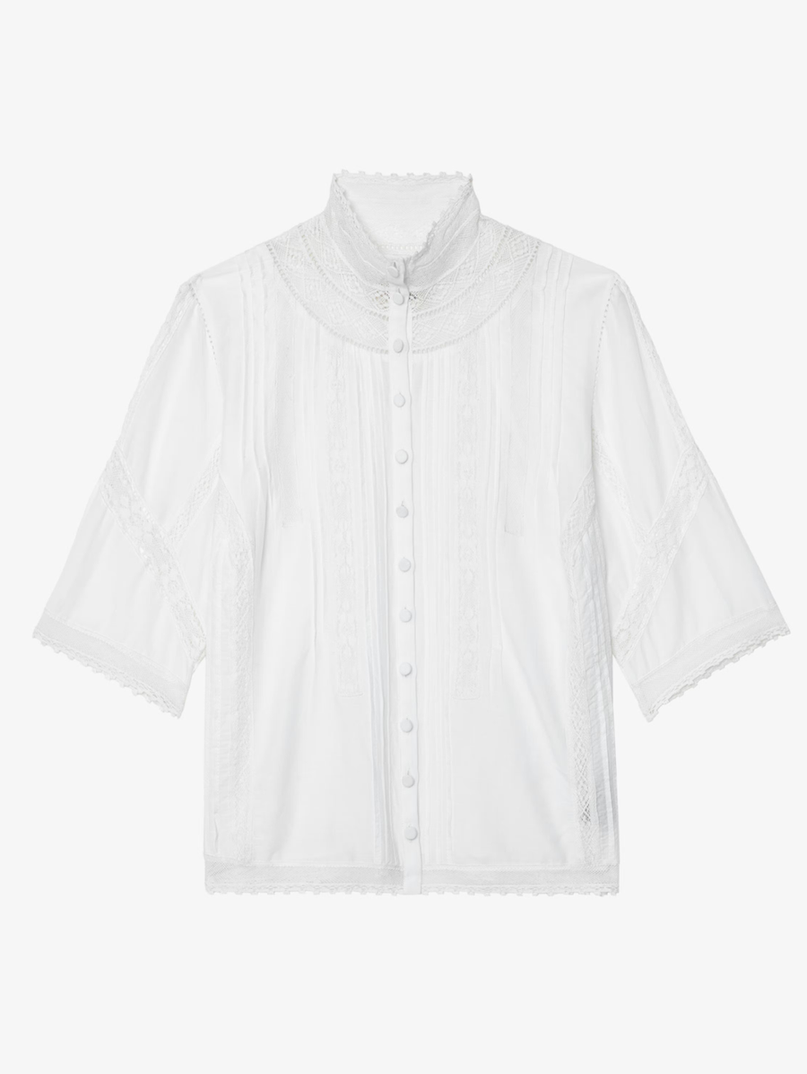 Amy Says... Lace details sweeten the style story of this button-up cut from an airy cotton blend that makes the most of the relaxed fit inspired by roomy shirts in his closet. Shop Blouses.**Cotton fibers from organic farming **Viscose fibers from sustainably managed forests -