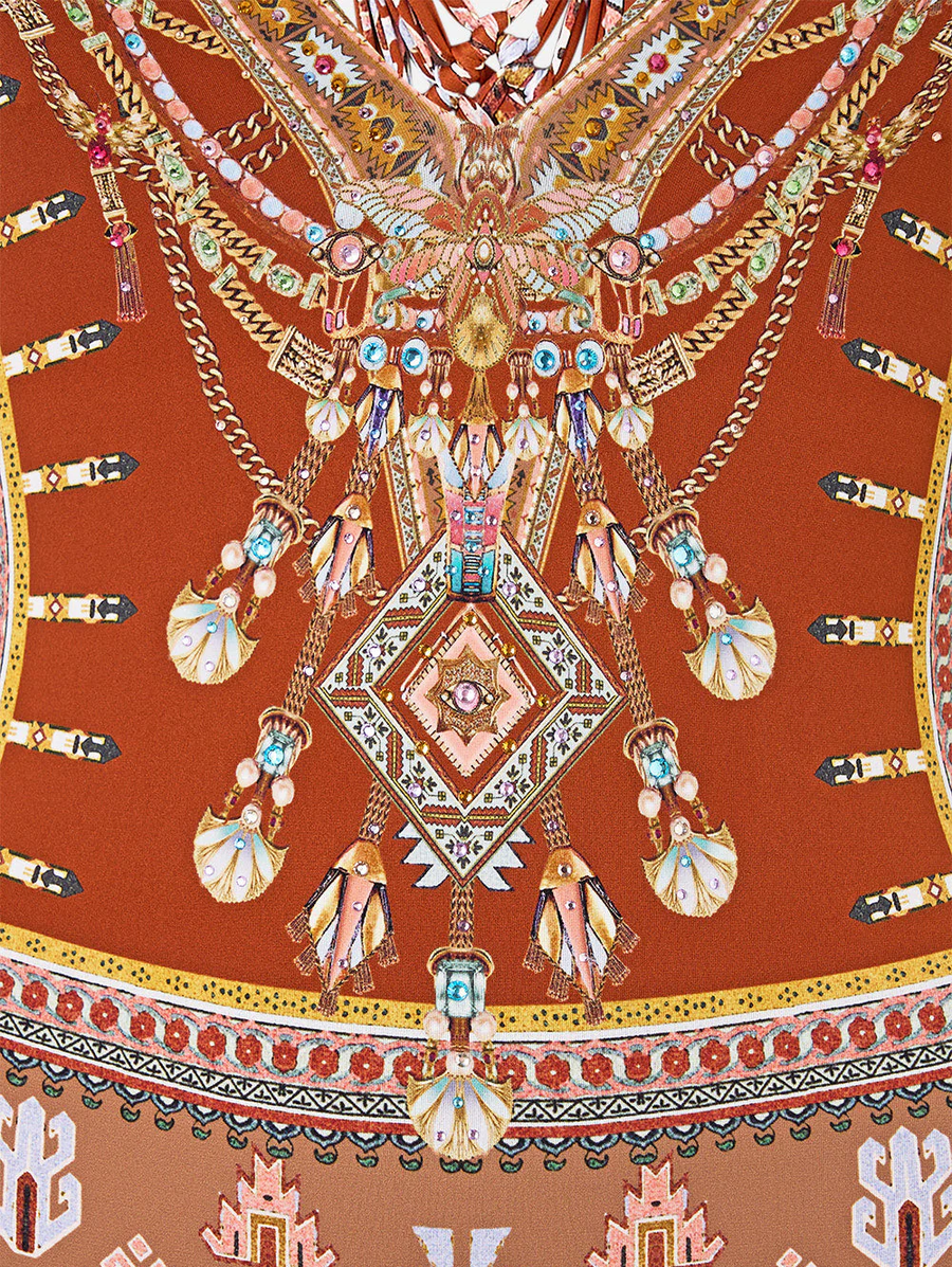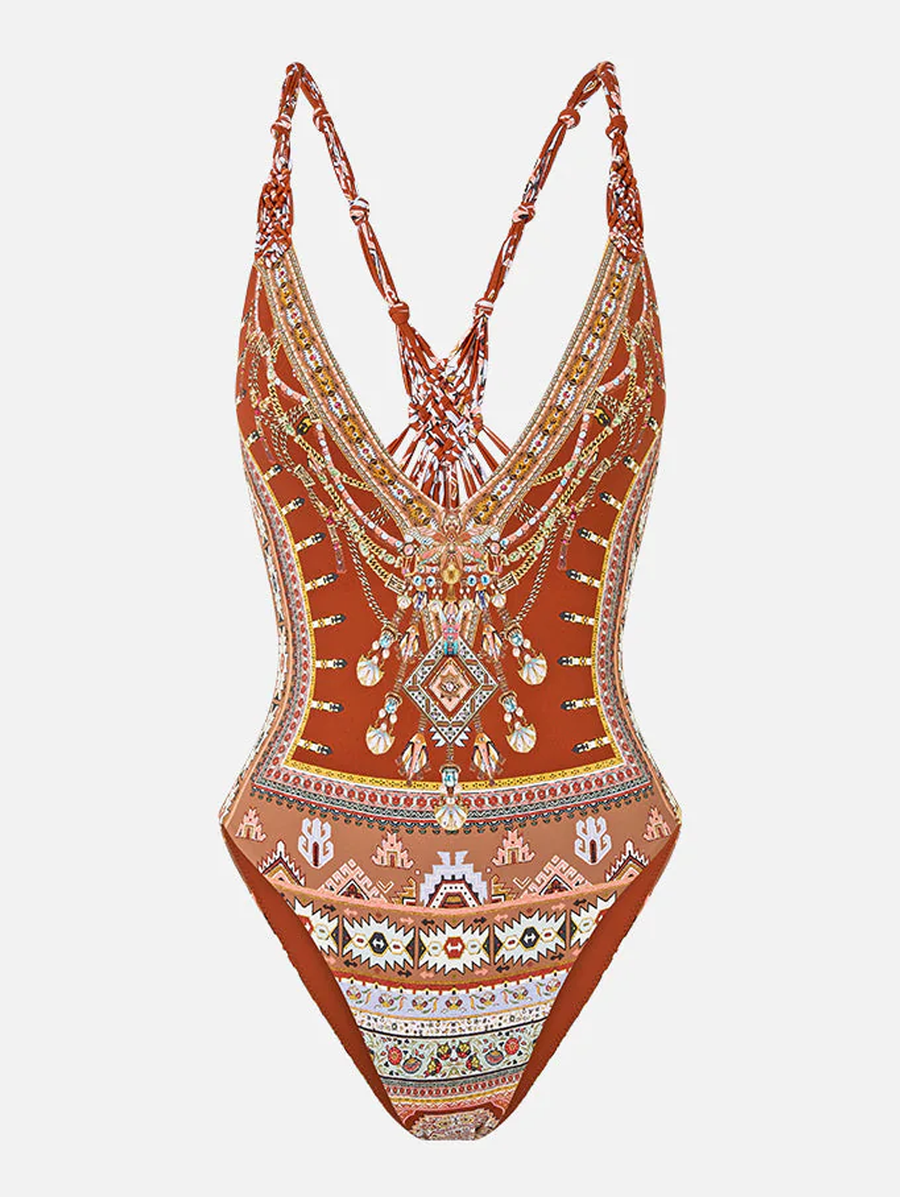 Amy Says... The Fabric Of Time V Neck One Piece With Macrame Straps is a handcrafted silhouette designed by our in house artisans. Reimagined in an exclusive limited edition print, this one piece is made for B to C cups, with removable soft cups. It features a V neckline that meets a high leg with cheeky coverage and is decorated with a macramé trim and multiple strap detailing. Its finished with intricately placed crystal embellishments for luminous detail. Shop Swim.