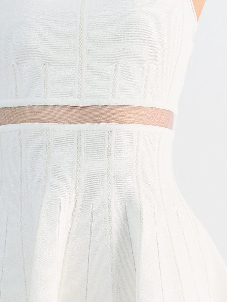 Amy Says... A signature RVN silhouette that balances architectural structure with feminine ease. Crafted from RVN’s proprietary sculpt-knit fabric, this dress features a fitted bodice that defines the waist and flares into a full skirt with sheer stripe panels for a play of texture and light. The neckline and precision knit seams enhance the dress shape, while the transparent hem reveals just the right amount of movement. Equally at home from day to night, this piece is the embodiment of RVN’s modern knit tailoring sculpted, elegant, and effortlessly sensual. Shop Dresses.