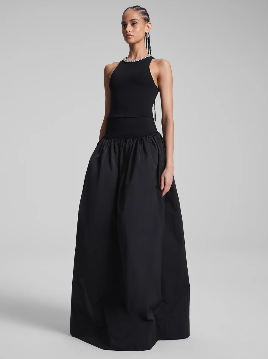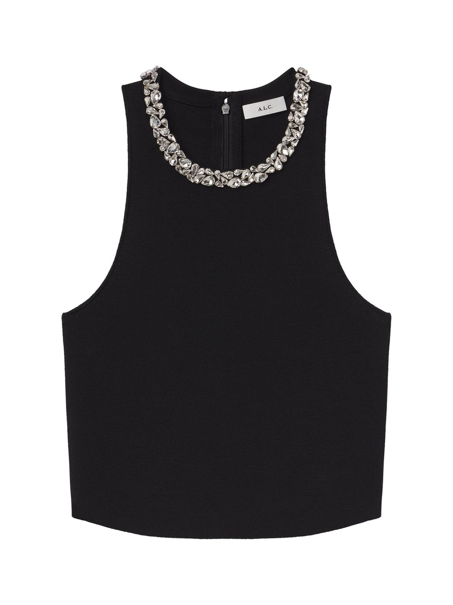Amy Says... The Bella Top is knitted from our compact knit fabric in timeless black. This sleeveless style features a high neckline adorned with hand-applied, teardrop-shaped crystals, inspired by dimensional chandelier glass. With a racerback silhouette, it adds a sport-luxe edge to your holiday and winter looks. Pair with a full skirt for proportion play and a subtle touch of shimmer.