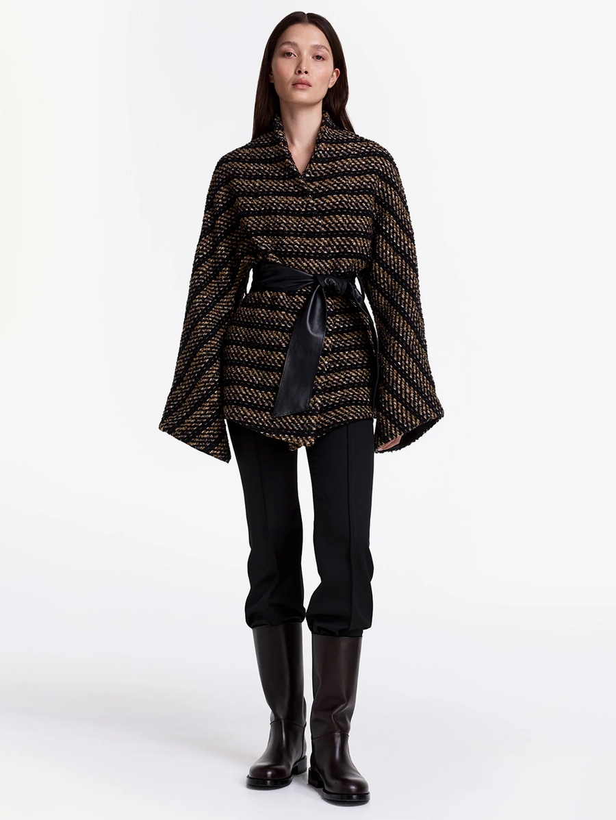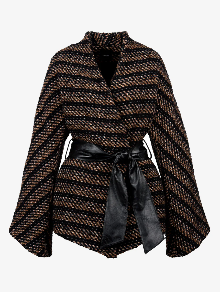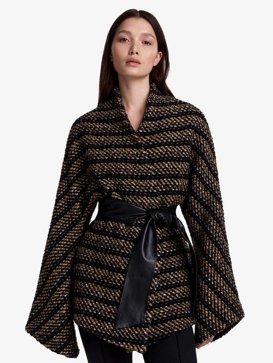Amy Says... Meet the Belted Wrap Jacket. It wears three ways—tied tight, draped open, or belted in back—making it one of those rare pieces that adapts as effortlessly as you do. A relaxed fit, this collarless belted wrap jacket features a wide leather sash, exaggerated sleeves, and side seam pockets. This garment fits true to size, take your usual size. Shop Jackets.