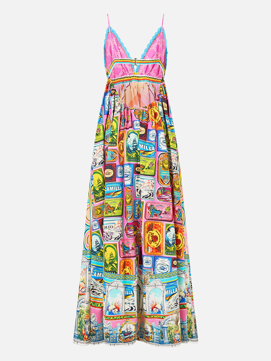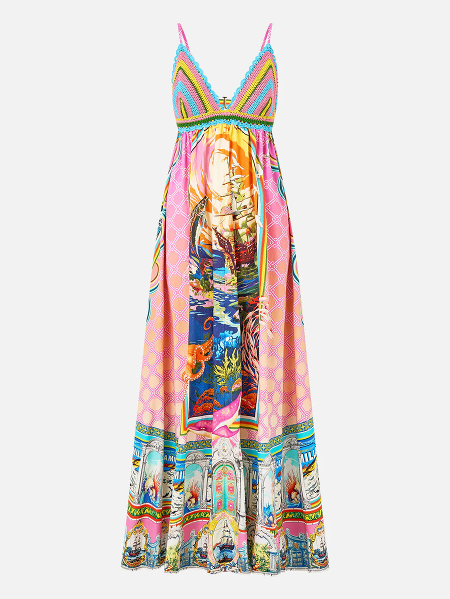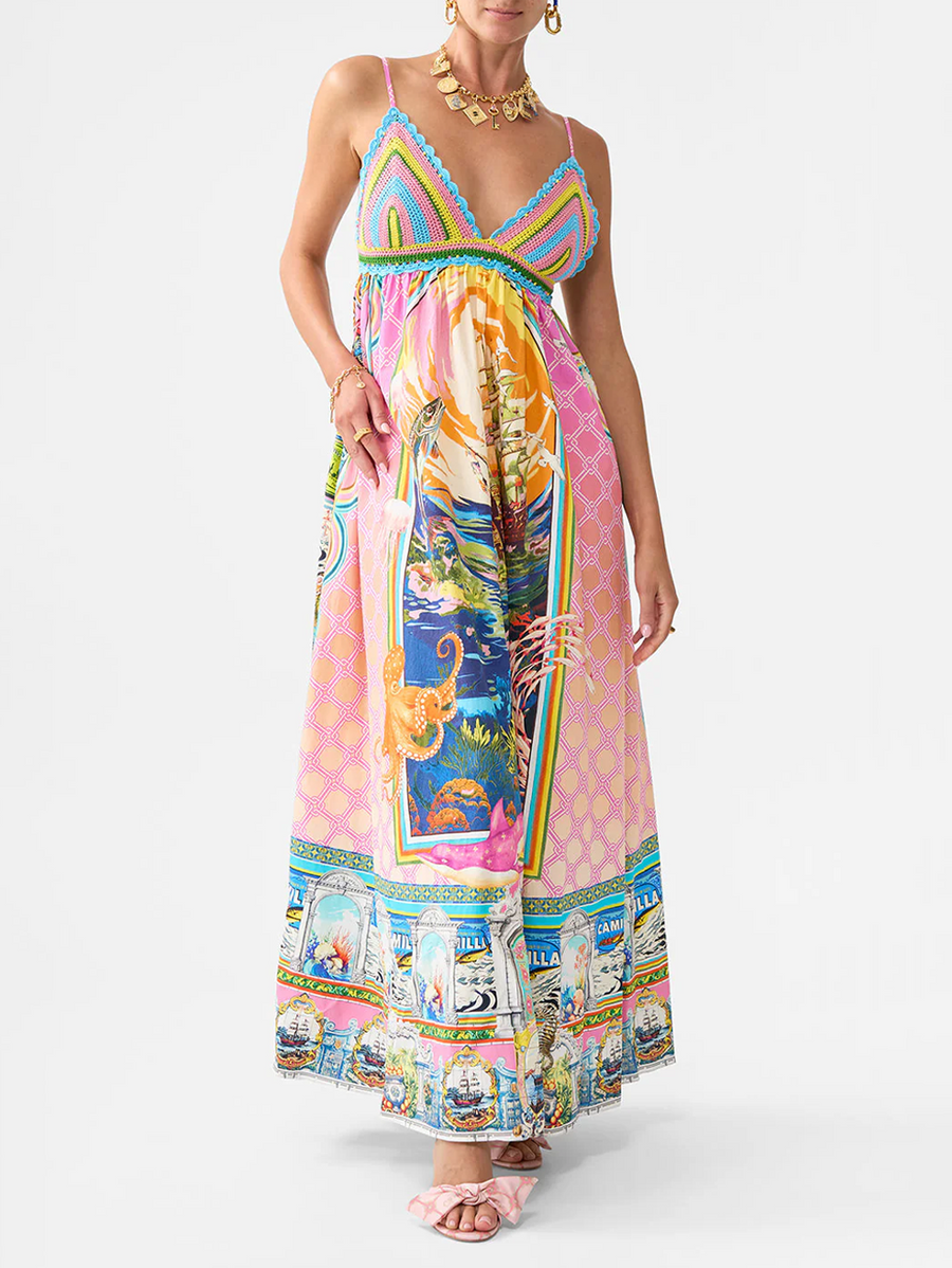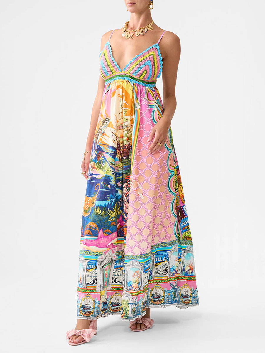 Amy Says... Designed in Australia, The Salty Splendor Bralette Detail Dress vibrantly expresses the vibrant ocean energy that mirrors Lisbon's Saint Anthony Festival, alive with music, laughter, and summer's fresh flavors. Lovingly handcrafted, this dress features a fitted bodice that flows into an off-body skirt, creating a striking contrast of structure and movement. The full-length design is enhanced by an elasticated waist detail, while the low open back adds an unexpected touch of allure.