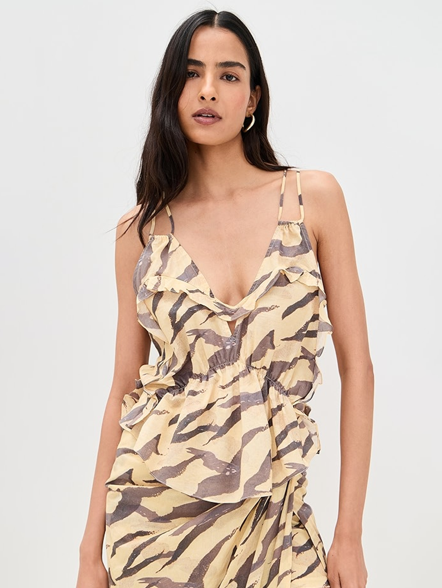 Amy Says... Iro "Dariah" printed cotton top with ruffled details. With it's plunging v-neckline this tiger print sleeveless silhouette pairs perfectly with the Dacca Printed Midi Skirt.