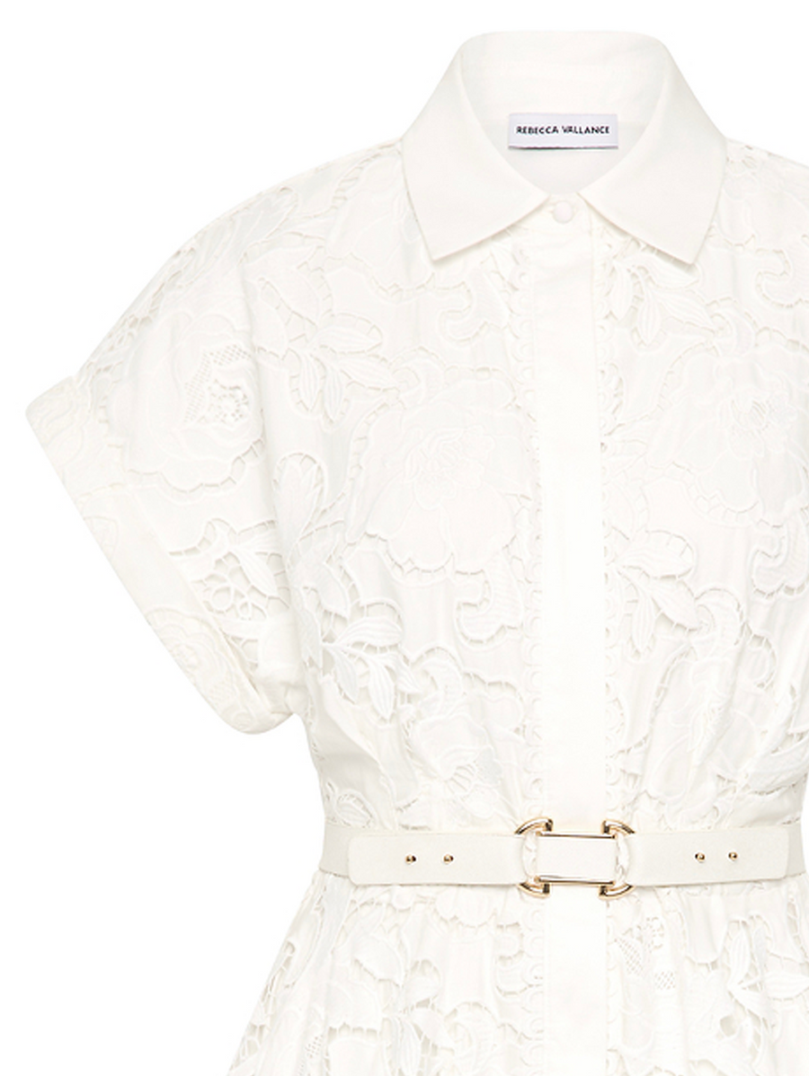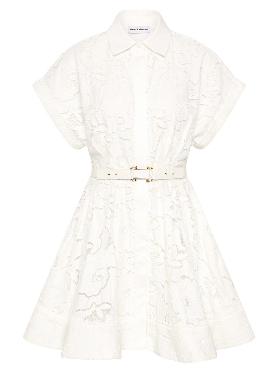 Amy Says... The Ginger Short Sleeve Midi Dress is eye-catching in ivory, tailored from broderie anglaise. Its collared neckline seamlessly harmonizes with the fitted bodice, complemented by wide short sleeves for a touch of modern sophistication. The a-line circular midi skirt, cinched and belted at the waist, is detailed with a wide trim for easy charm and enhanced with side pockets for added convenience. Fully lined and finished with a button front closure, this dress is a lovely choice for your next special event.