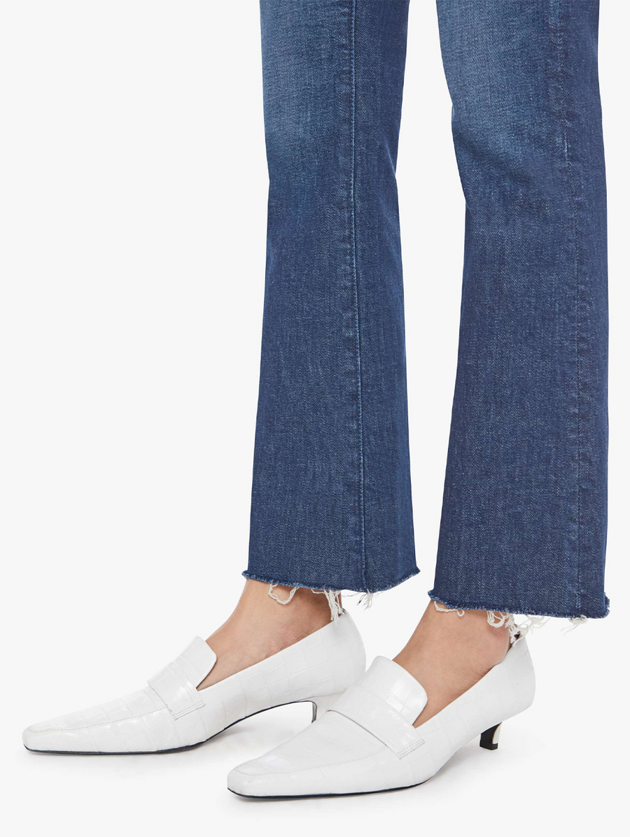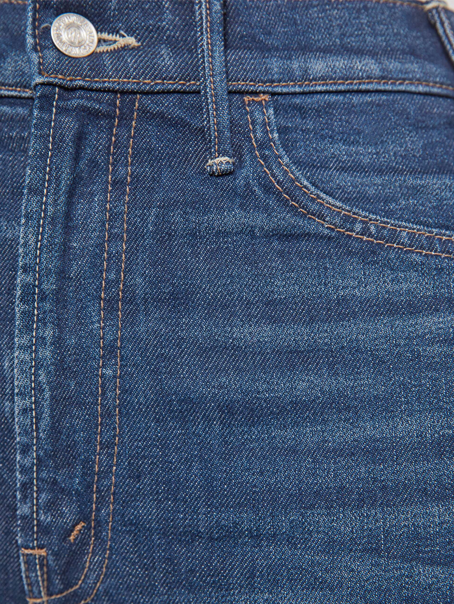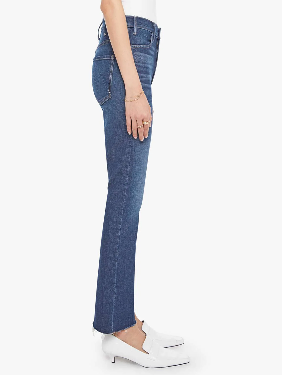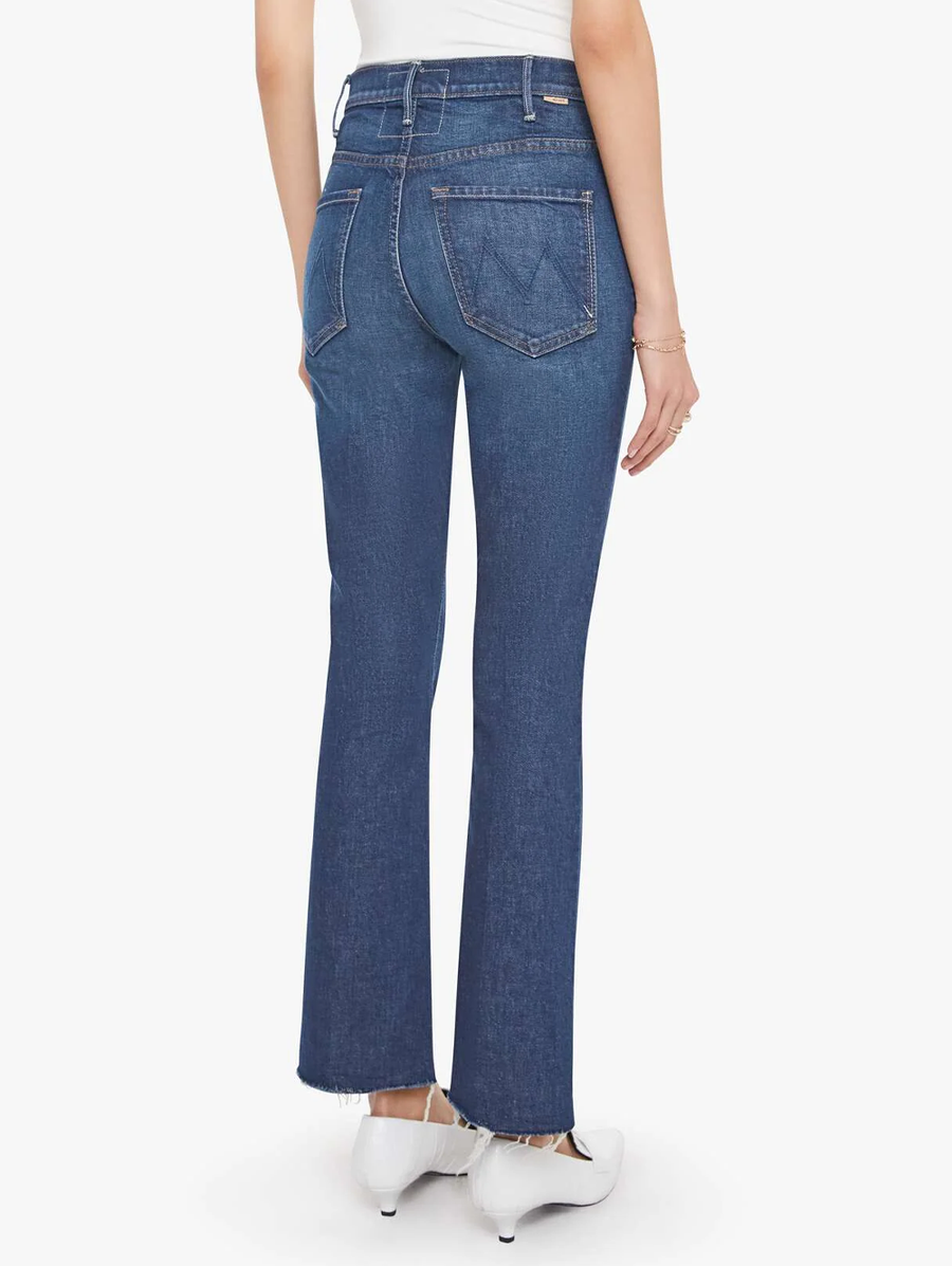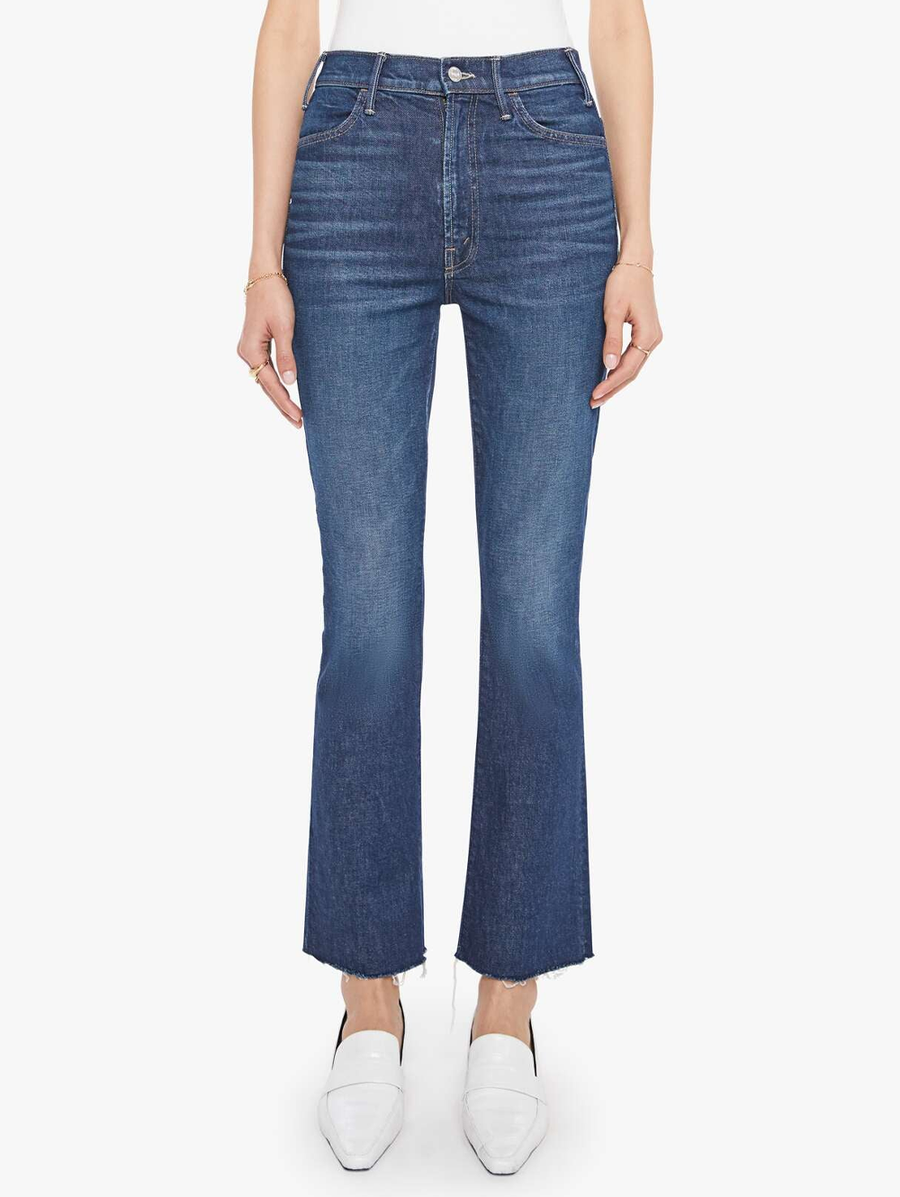 Amy Says... Amped up. This high-rise flare has a zip fly, 28.25-inch inseam and a frayed hem. Made from semi-rigid SUPERIOR denim, Kicks And Riffs is a dark blue with subtle fading and whiskering. These jeans are semi-rigid and take time to break in. MOTHER says patience is a virtue. Made in Los Angeles utilizing fine imported materials. Shop Denim.