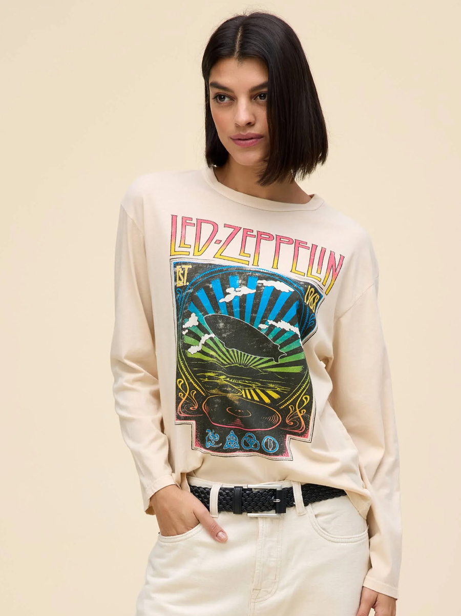 Amy Says... Add to your collection with a Crew Long Sleeve meant to mimic a relic. Tributing the legendary British rock band, Led Zeppelin and their recognized blimp promo hit this multi-colored reflection graphic featuring records and the group's iconography.