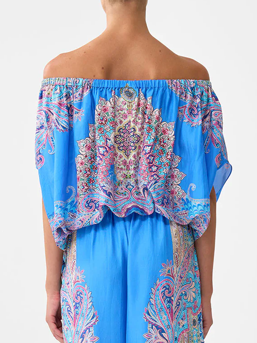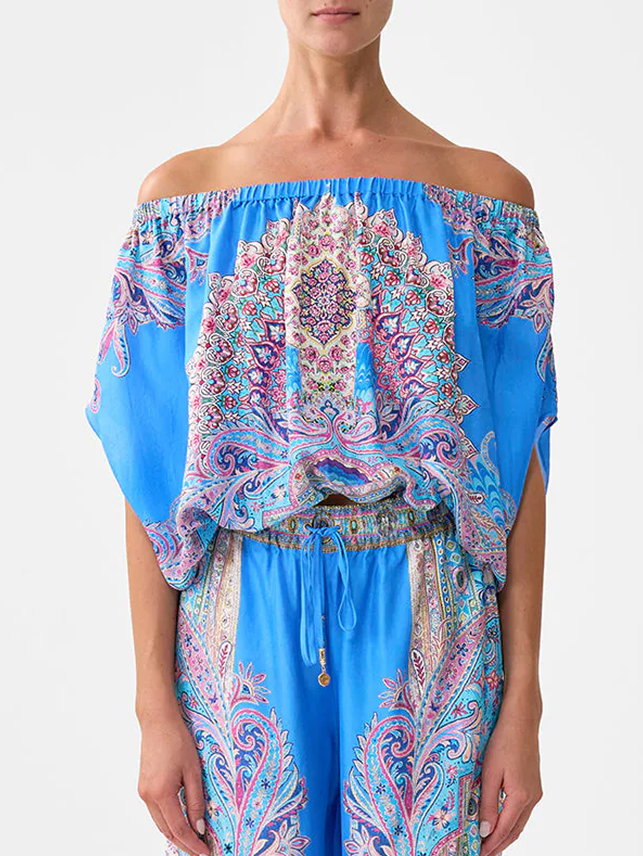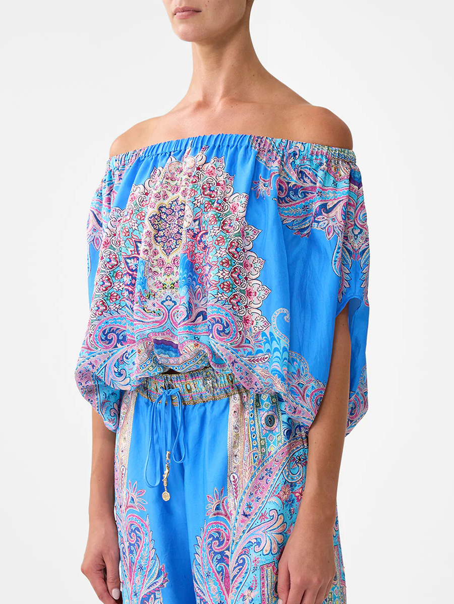 Amy Says... The Footsteps In Folklore Off Shoulder Elastic Top is a handcrafted silk silhouette designed by our in house artisans. Reimagined in an exclusive limited edition print, this top features an off the shoulder, elasticated neckline that is framed by short, voluminous sleeves for romantic movement. The neckline falls to a softly bubbled hemline that is cut with a cropped length for sculptural shaping.