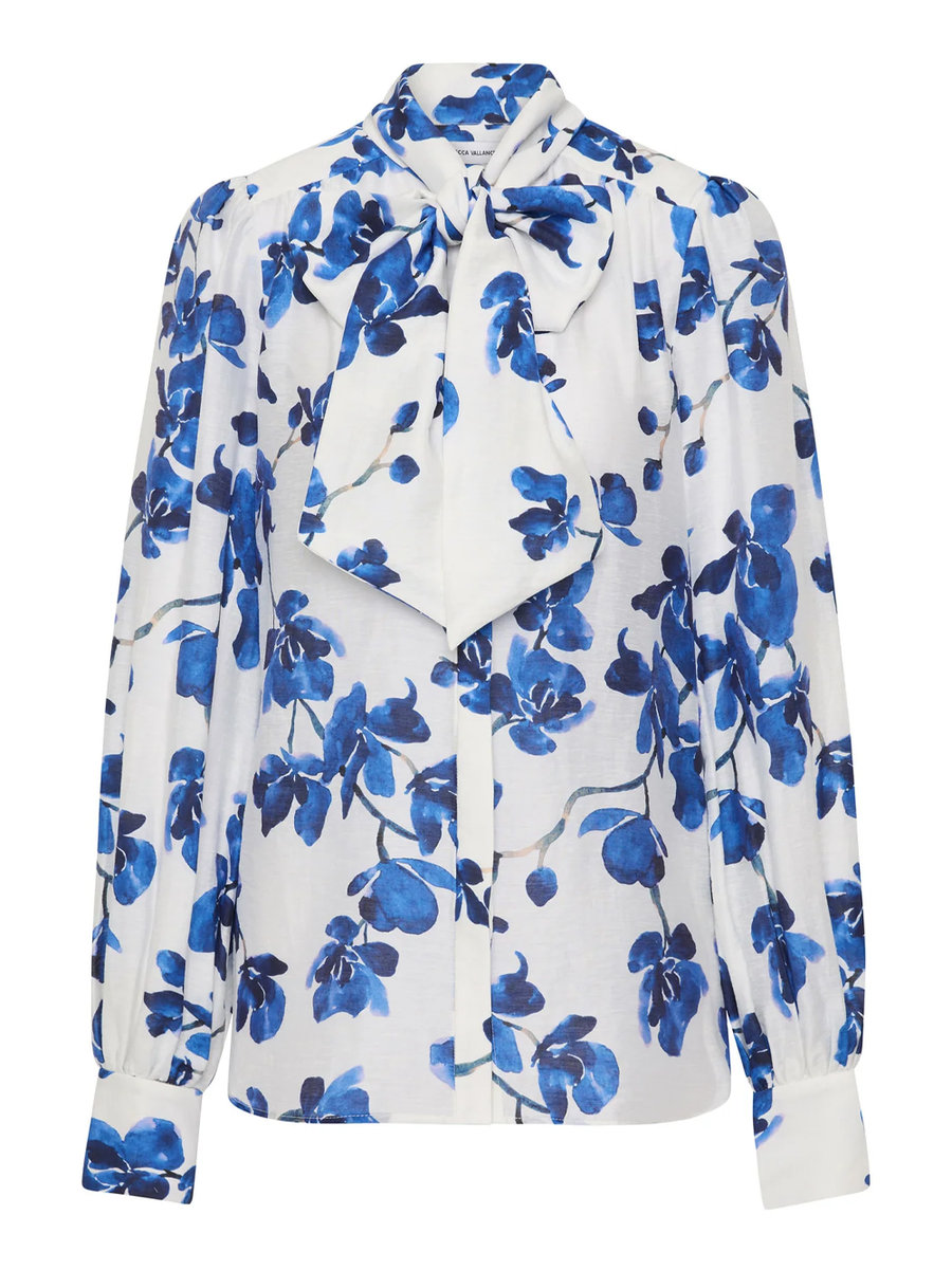 Amy Says... The Orchid Blues Blouse blends timeless elegance and contemporary design. Highlighting a chic pussy bow neck tie, the long blouson sleeves and relaxed silhouette create a refined look. The concealed placket and curved hem offer a polished finish, while the cuffs with exposed white button detailing add a playful touch to the design. Versatile and stylish, this blouse pairs effortlessly with our Orchid Blues Skirt for a stunning matching set.