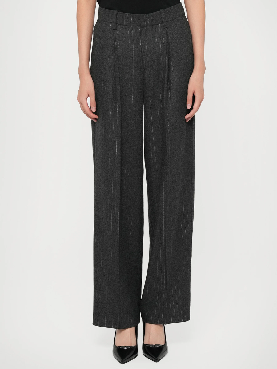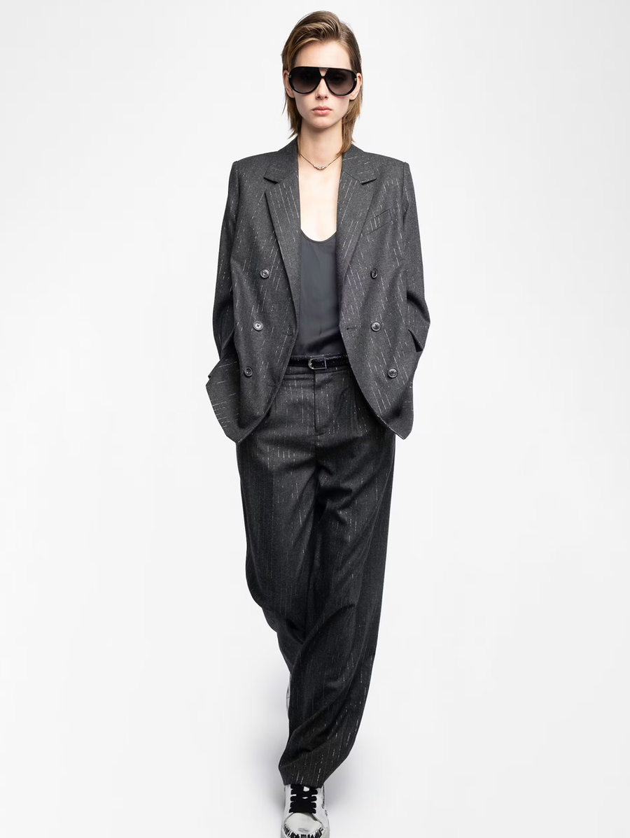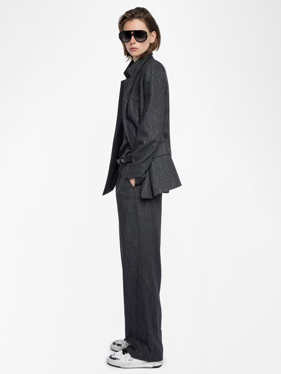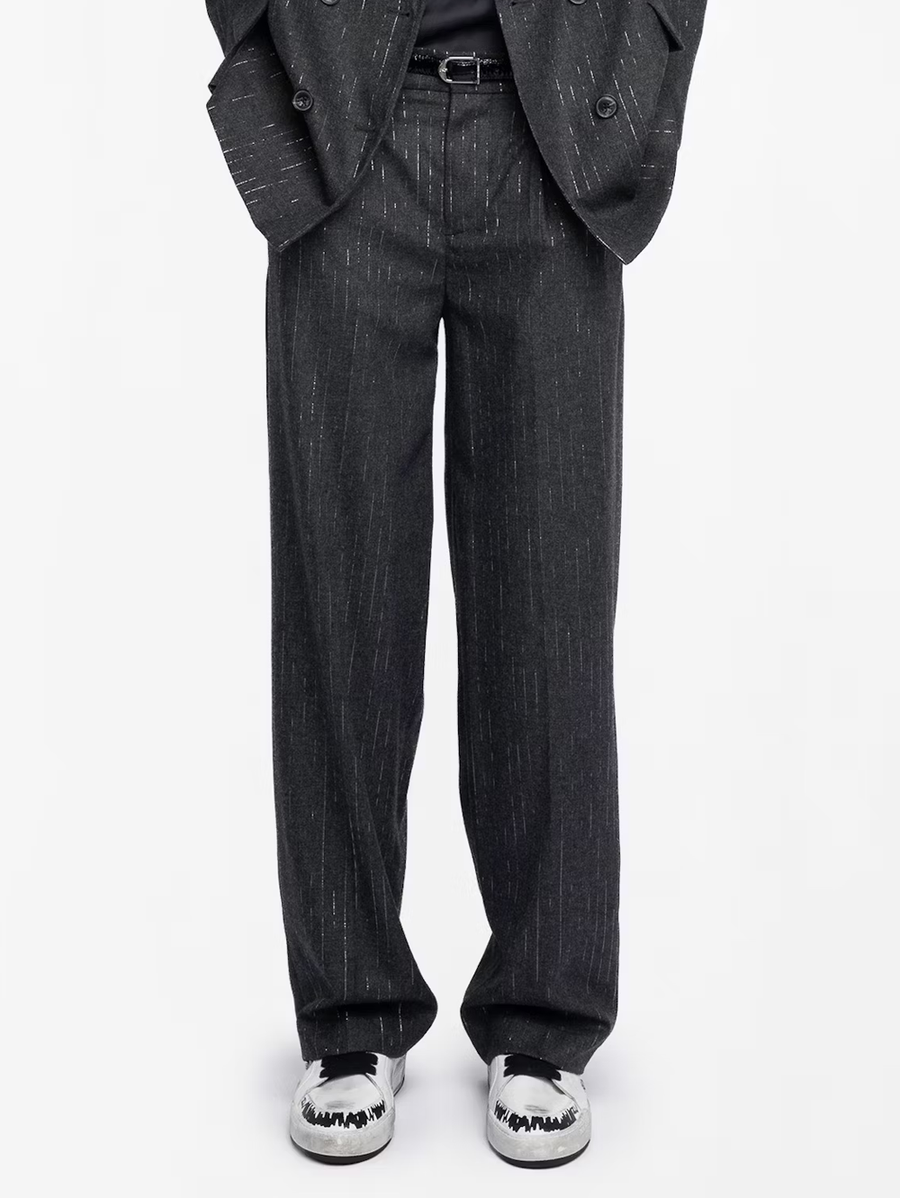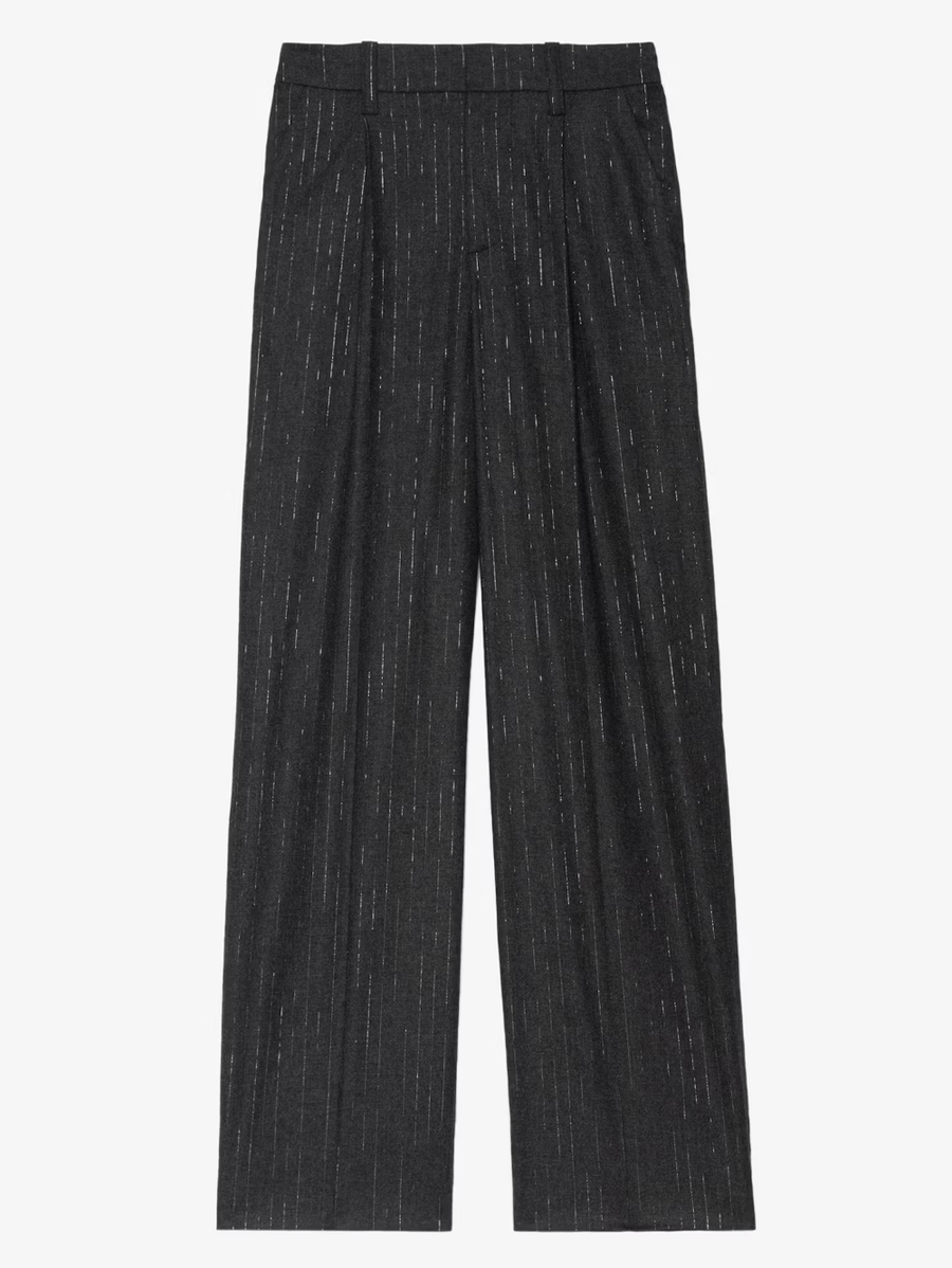 Amy Says... The Zadig & Voltaire PUROS STRIPES PANT is a straight-leg, high-rise flannel trouser featuring subtle shimmer or raw-edge stripes, cut in a dark grey or anthracite color. These tailored pants blend a sophisticated design with a modern, slightly undone aesthetic, made from a wool-blend fabric for comfort and a touch of stretch. Finished with Italian side pockets, a concealed or button fastening, and a regular fit. This item fits true to size. Choose your usual size. Shop Pants.