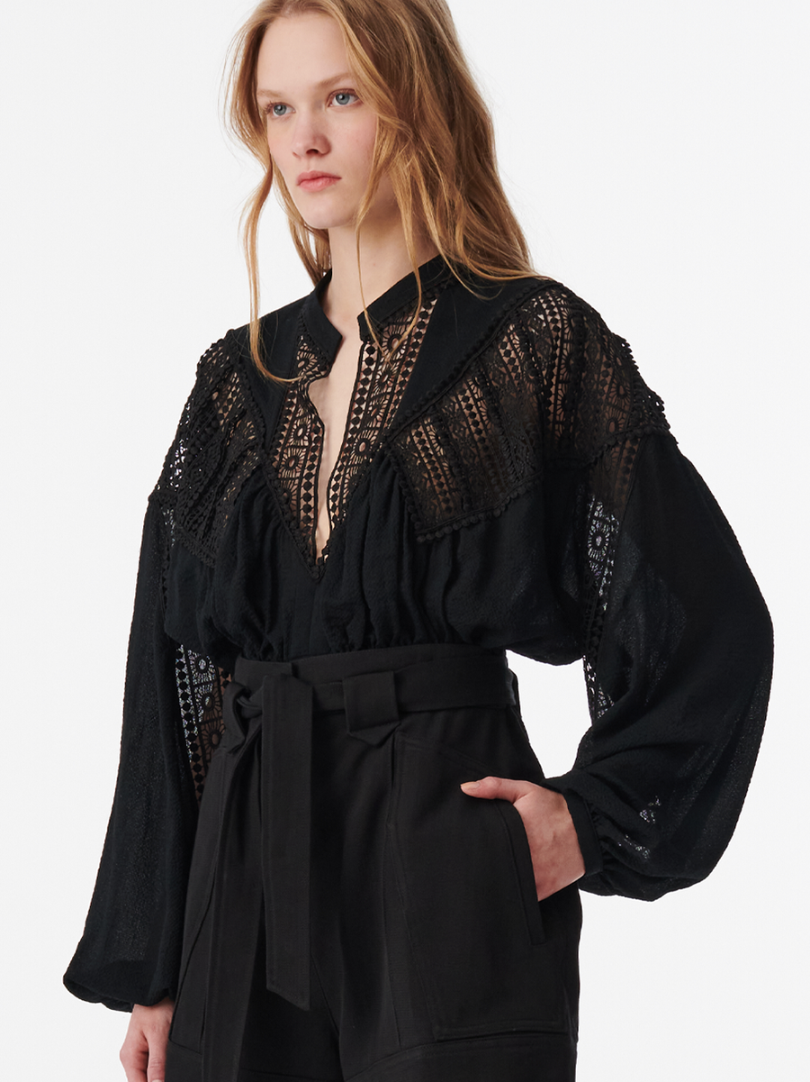 Amy Says.... Introducing the Rixi Top, a loose silhouette with gracefully long sleeves and features an elastic waistband that offers a gently gathered effect, exuding elegance and contemporary flair. Crafted from lightweight fabric, this piece melds the softness of polyester with a touch of elastane. The top is adorned with intricate lace inserts along the upper bodice and shoulders, adding a touch of sophistication and style. The delicately slit neckline with a subtle stand-up collar further enhances its allure. The lace details boast geometric patterns that create stunning translucence, making it an ideal choice for elegant outings. This top is the epitome of classic charm blended with modern design.