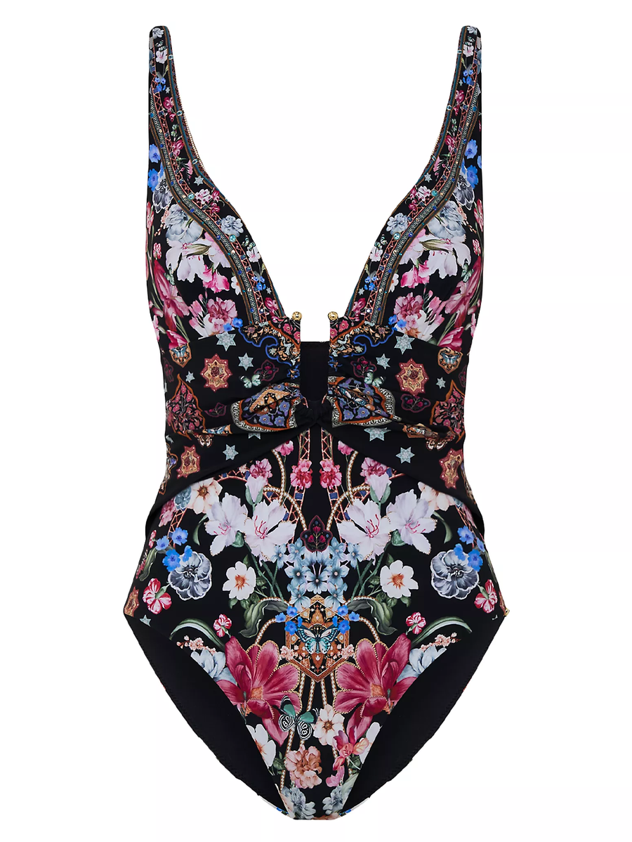 Amy Says... This Camilla one-piece swimsuit is adorned with an intricate floral motif. The plunging V-neckline features a D-ring hardware detail and an interior underwire at the bust.