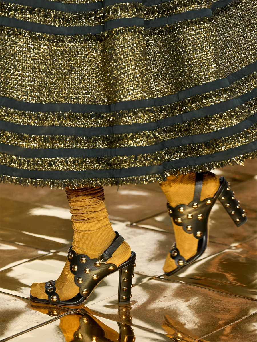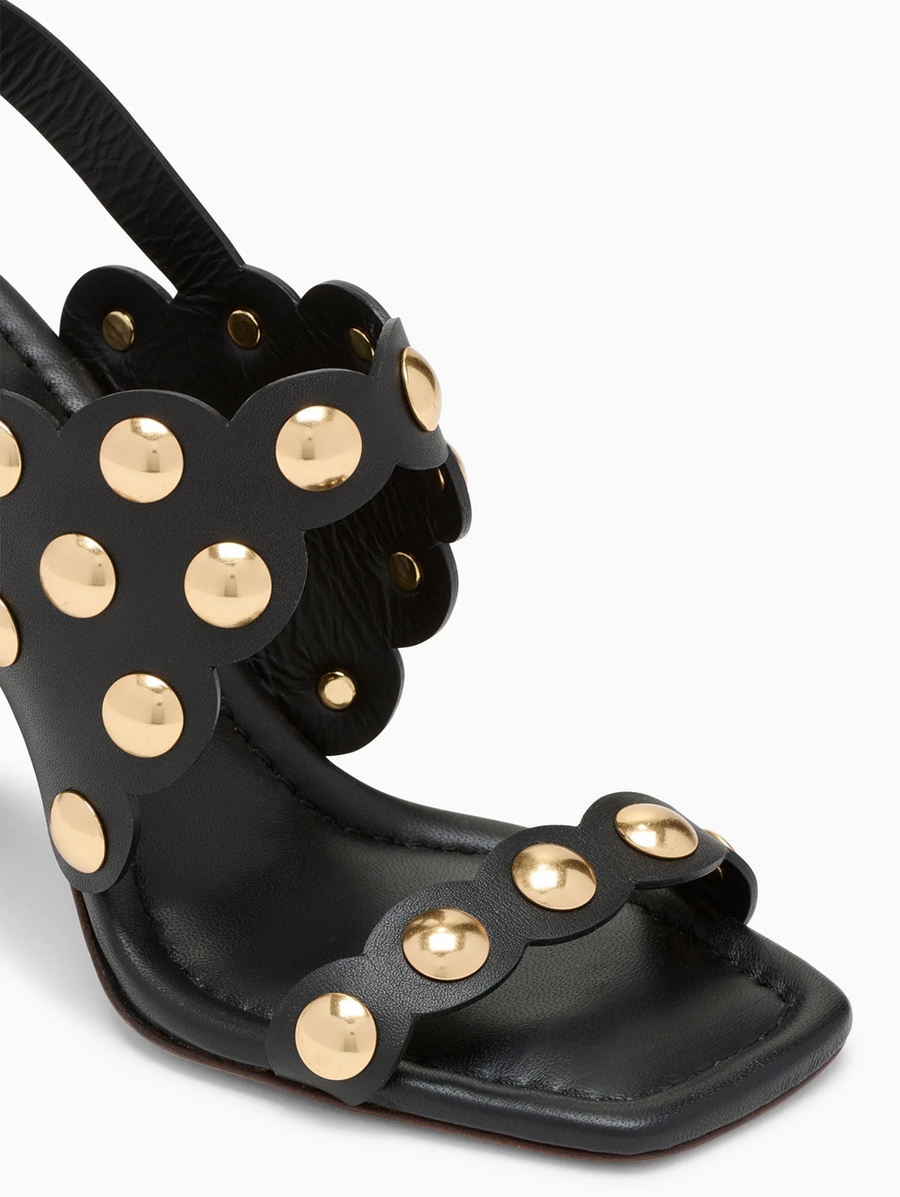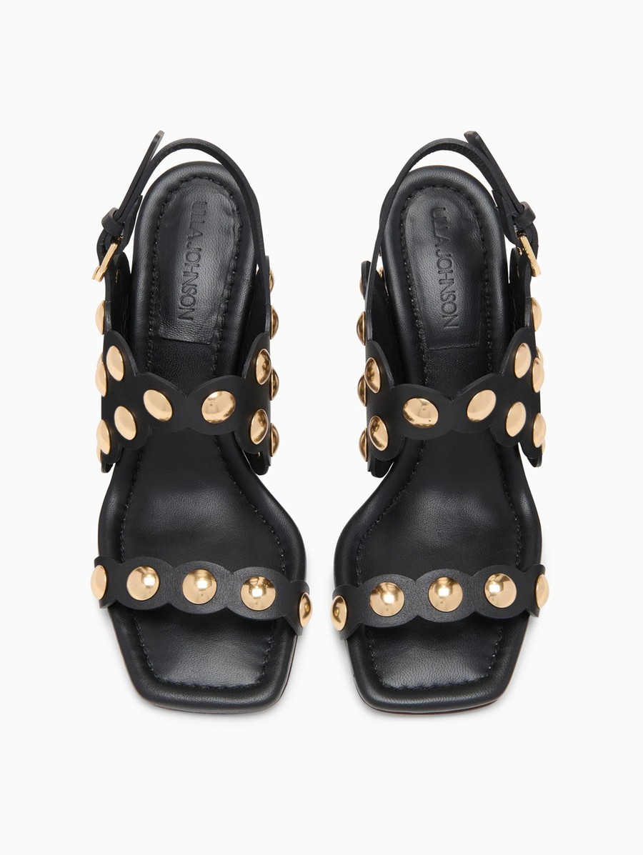 Amy Says... Featured throughout the AW25 Ulla Johnson runway, the Vendome Heel is crafted in Italy from black leather that's boldly contrasted by dome-shaped golden studs. The block heel ensures elegant yet wearable elevation. Shop Shoes.