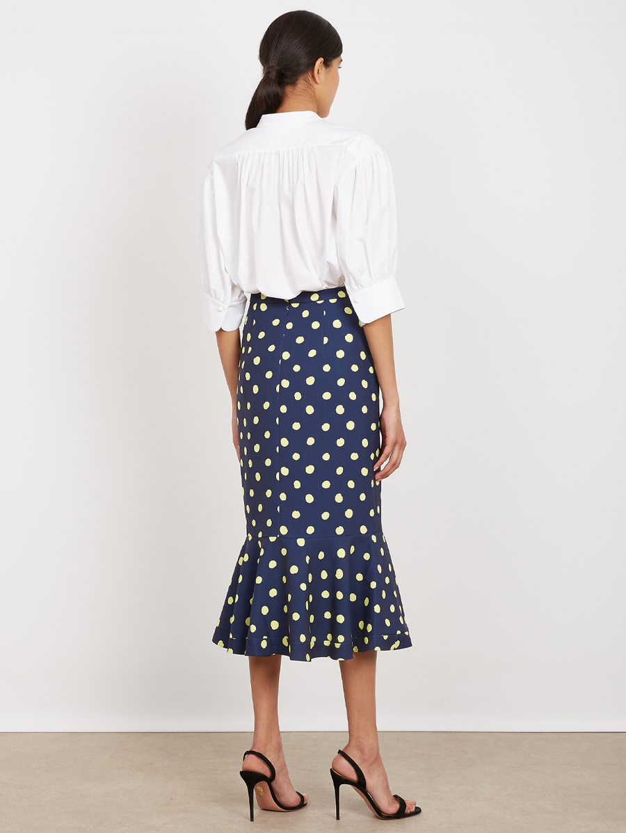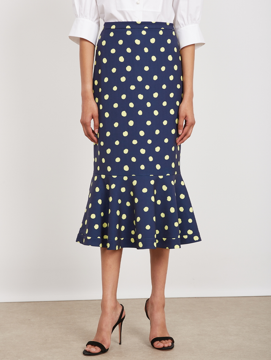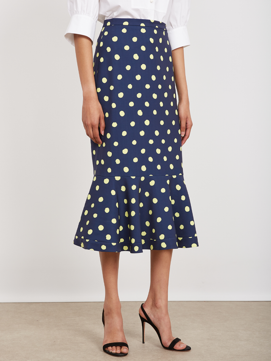 Amy Says... A stylish, fitted midi skirt crafted with a flattering, figure-hugging shape that flares out into a fluted or ruffled hem, cut in a navy double crepe fabric with lemon polka dot pattern. Featuring an exposed zip and full lining for a glamorous, versatile look that can be dressed up or down. Shop Skirts.