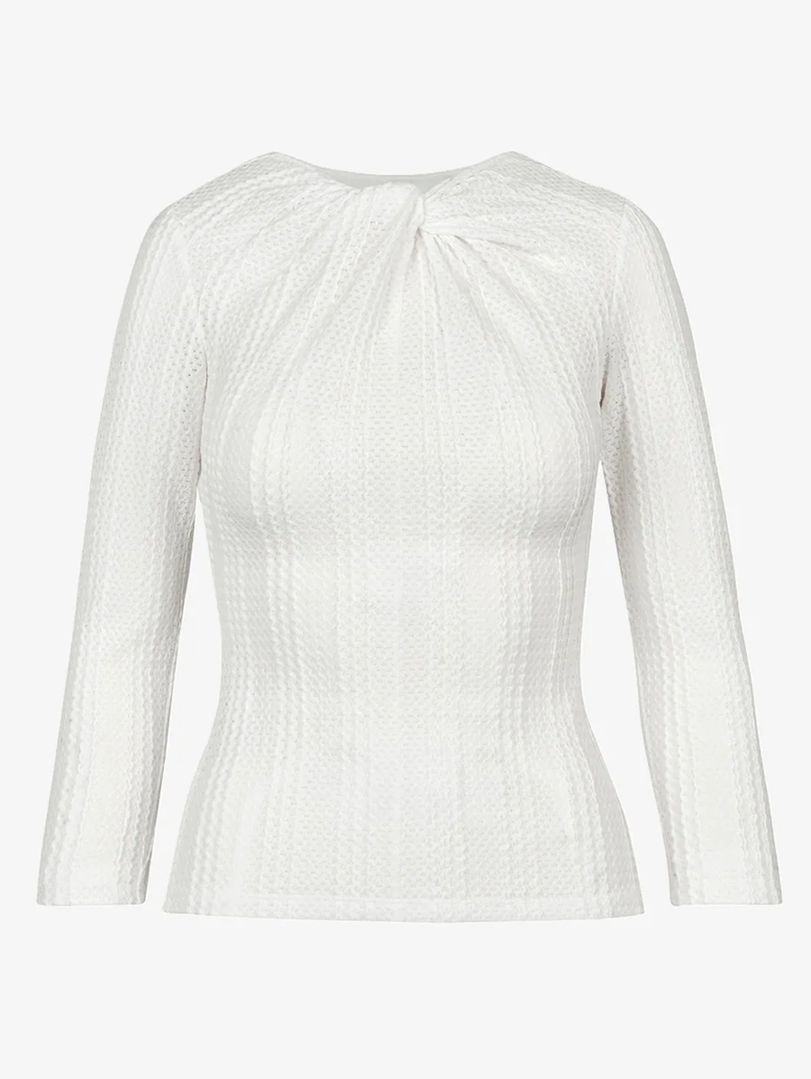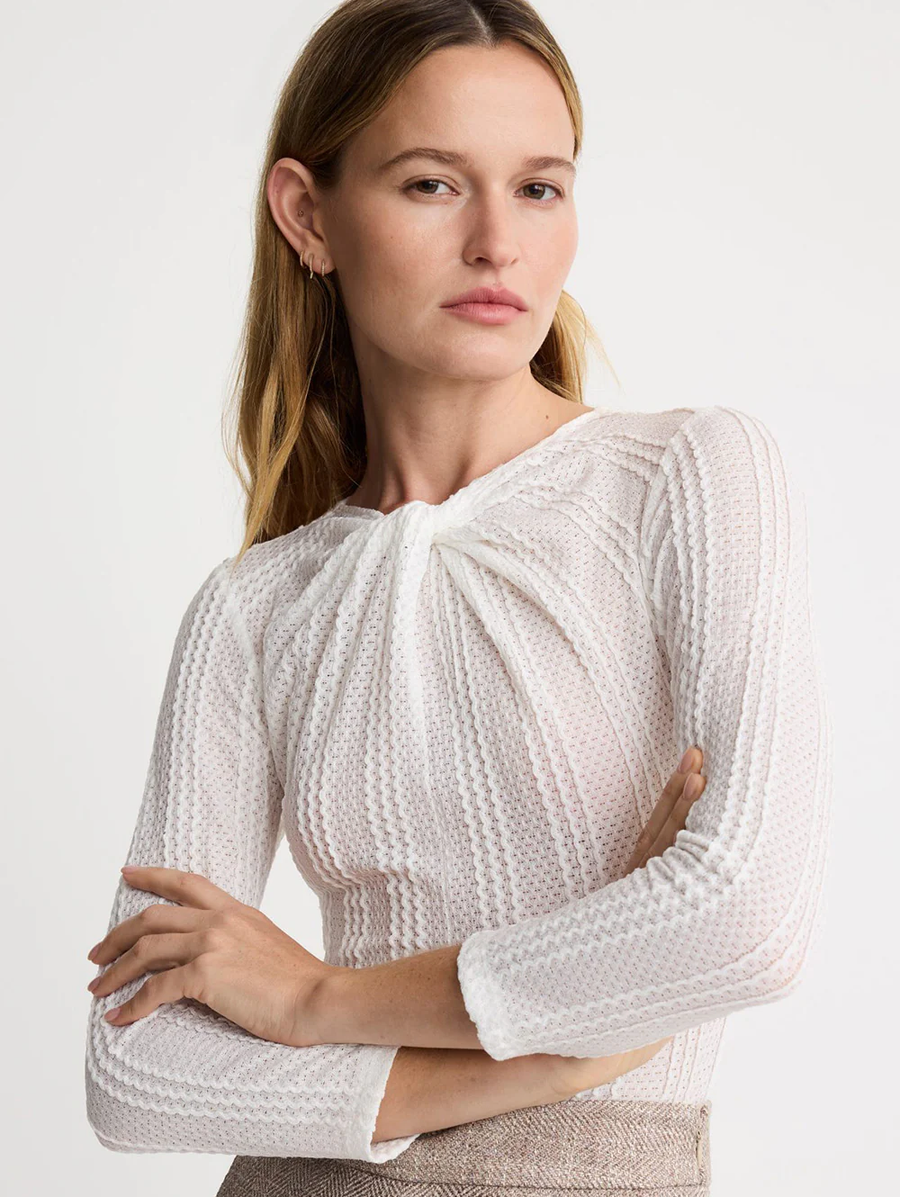 Amy Says... This new pull-on top silhouette is a close-fitting knit that features a textured weave and twist detail at the neck and ¾ length sleeves. Pair it with tailored suiting for a sharp, considered finish. This garment fits true to size. Shop Tops.