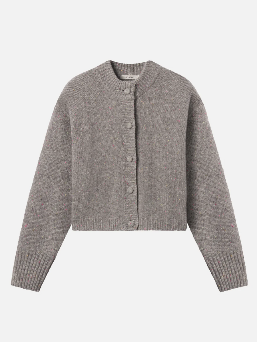 Amy Says... This pure cashmere cardigan is knit in a light grey yarn, envlivened by multi-colored flecks throughout. A relaxed silhouette, ribbed at the neck, cuff and hem and finished with luxe self-covered cashmere buttons. Wear it solo or layered over a T-shirt, and pair with Le Slim Palazzo Jean in Meteor. Shop Sweaters.