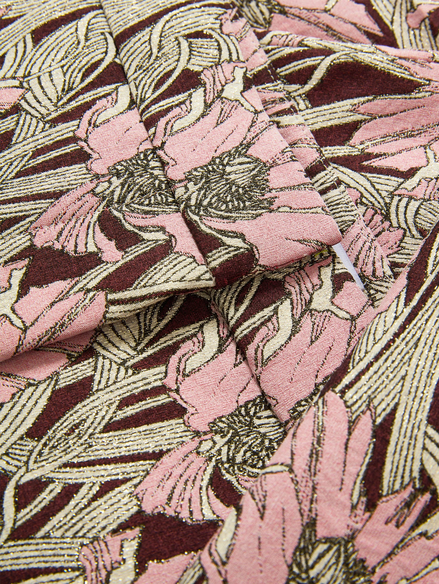 Amy Says... A VB favorite, reimagined in burgundy and pink florals. The Arte pants are cropped and high-waisted with a slim fit and slight flare. Flat welt pockets and a hidden hook-and-bar closure create a sleek, tailored look, while metallic gold threads add a subtle sheen for an elevated finish. Perfect for everyday polish, style it with the coordinating Jessup vest for a matching set or with a cashmere tank top for something more relaxed. Shop Pants.