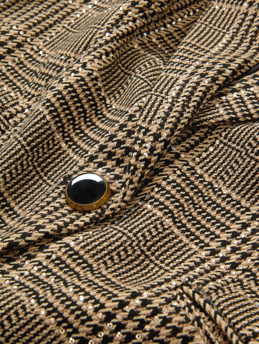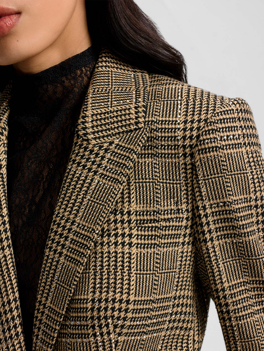 Amy Says... A high-shine take on a tailored classic. Crafted from a luxe tailoring blend in glen plaid, the Kendryn is adorned with allover crystal appliques for sophisticated sparkle. Slim and fitted, it features a cutaway hem, angled welt pockets, and a single button closure. Pair it with denim to elevate the everyday, or with the Pavaline pleated skirt for a cool take on the skirt suit. Just add a dickey to switch up your look. Shop Blazers.