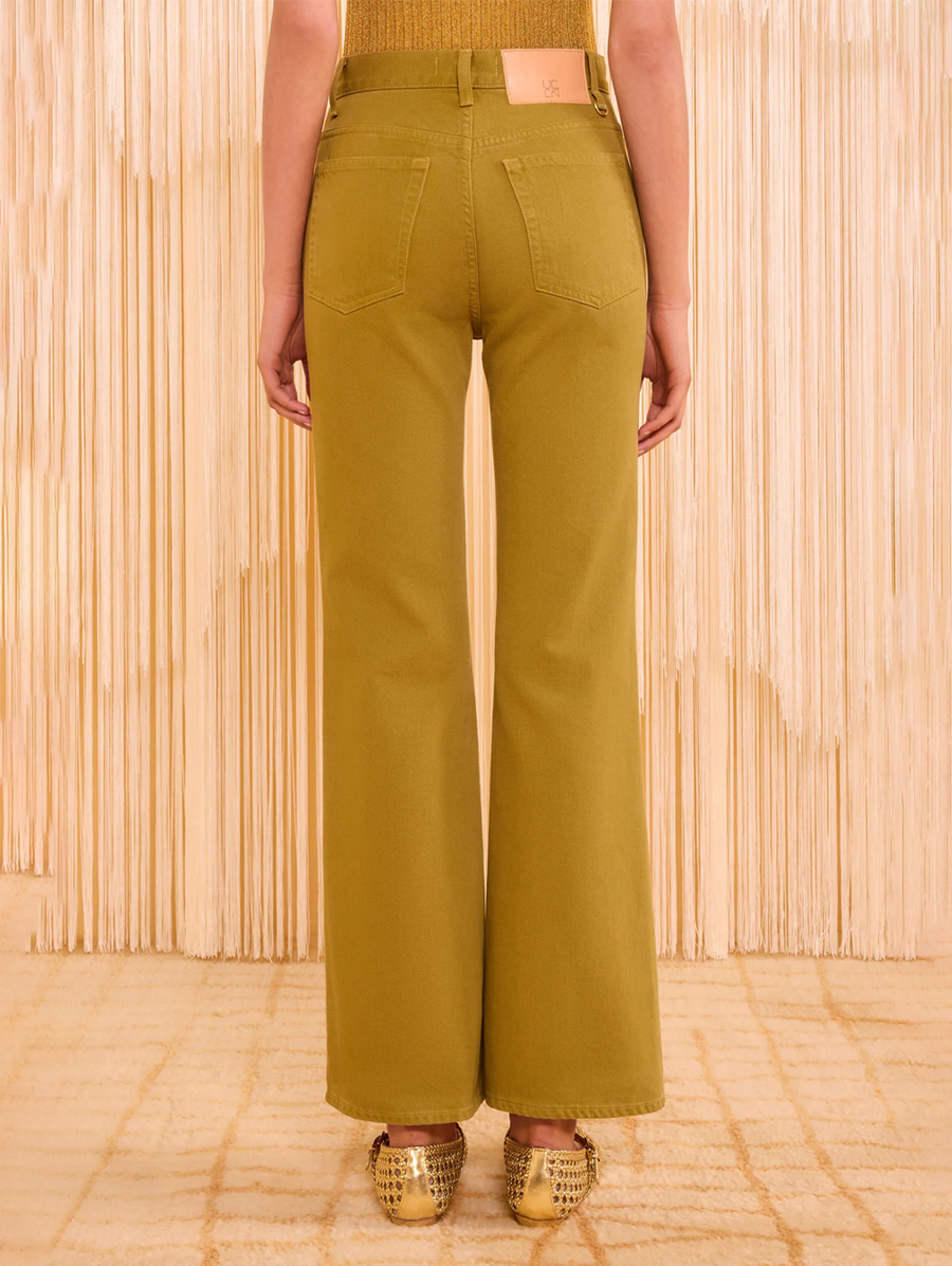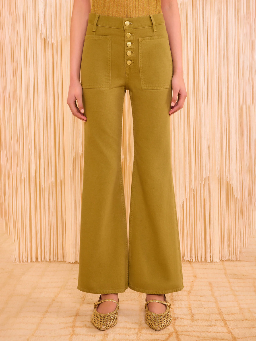 Amy Says... A forever-favorite silhouette, the Lou Jean is responsibly handcrafted in Los Angeles from non-stretch denim with oversized patch pockets and a vintage-inspired flared hem. This elevated essential arrives in the new Argan wash, a rich green that's softened for a lived-in feel and has a flattering high-rise waist with their signature monogrammed buttons exposed at the center front. Shop Denim.