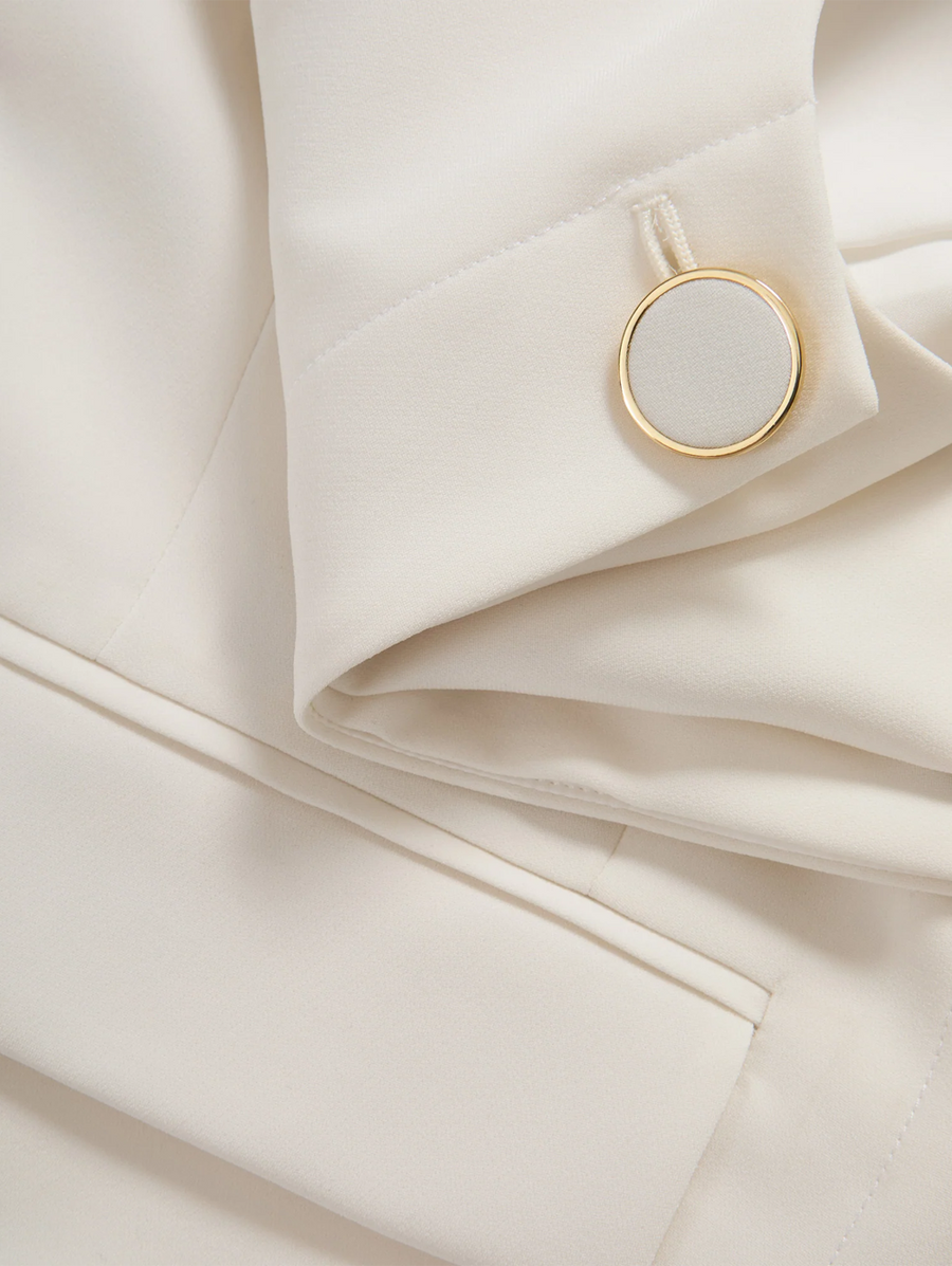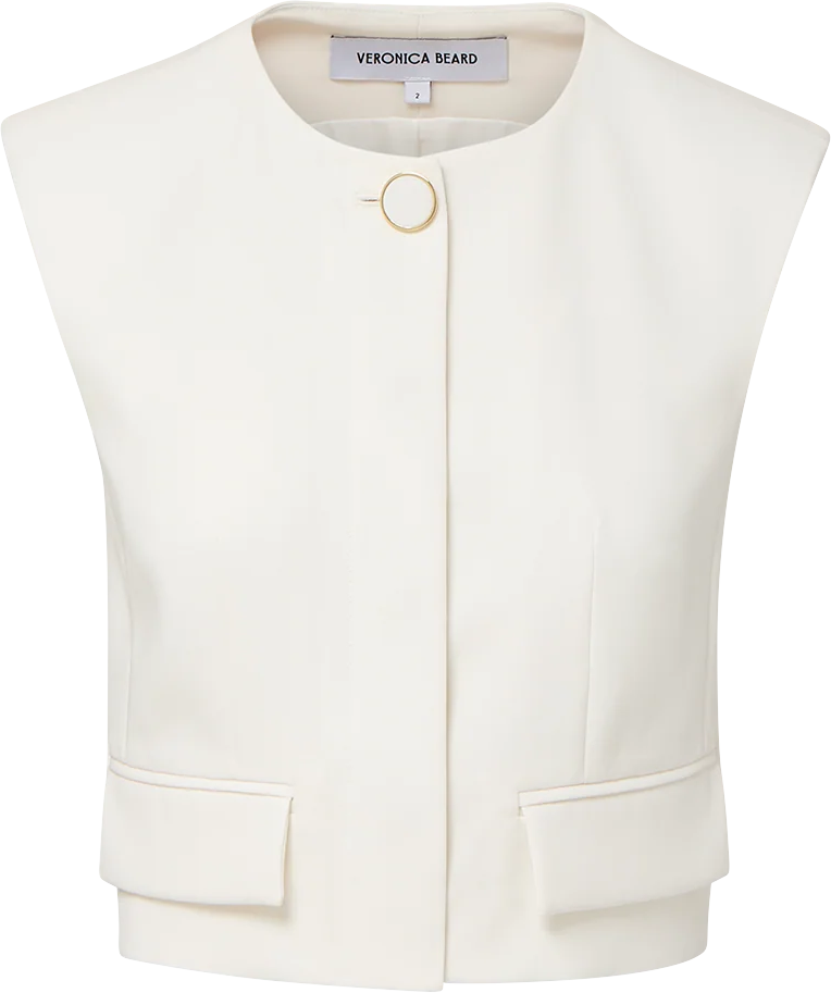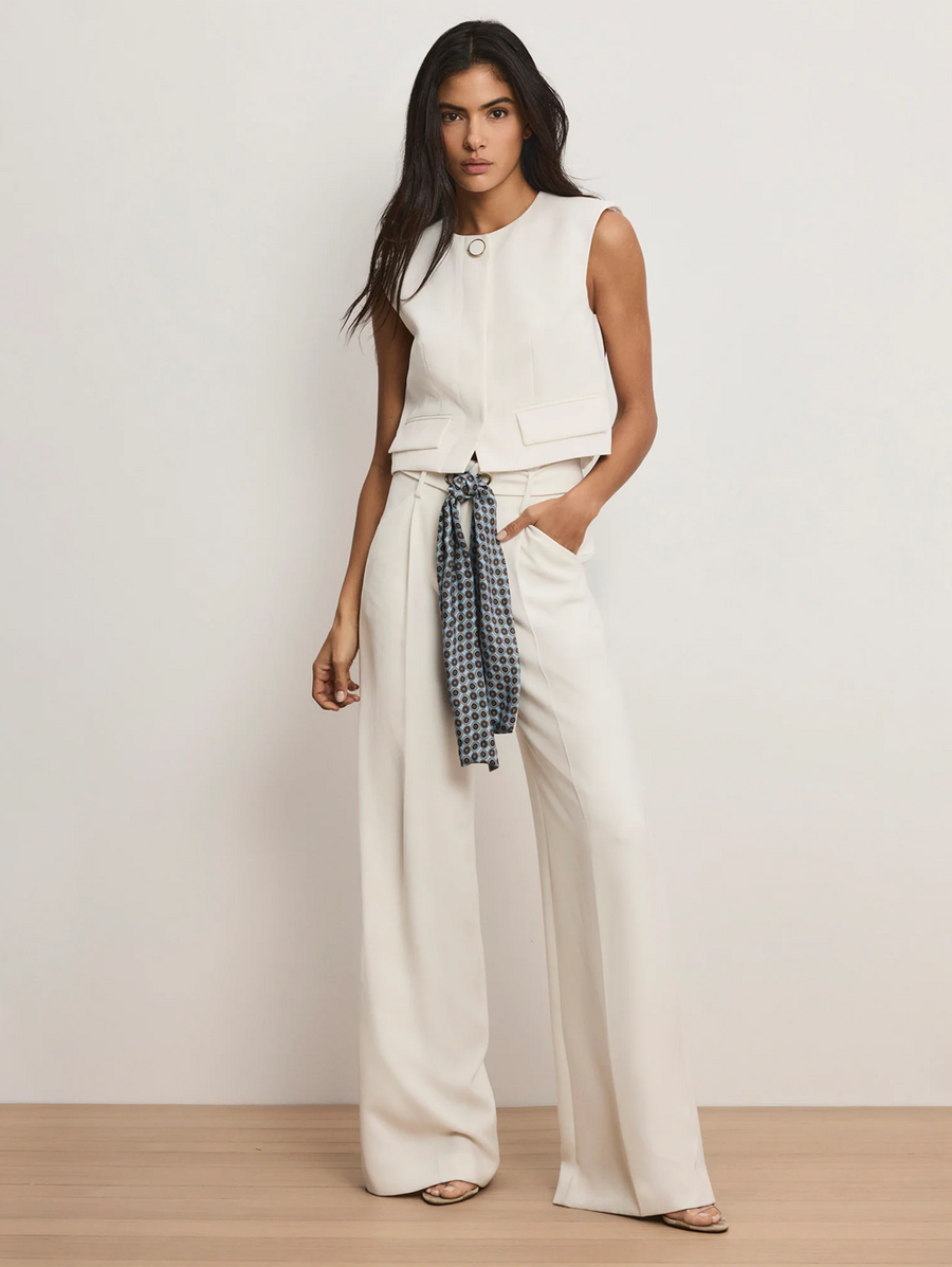 Amy Says... An elevated take on the vest—in chic off-white for spring. Made from Japanese stretch crepe, the crewneck Cliffwood is expertly tailored like a blazer, down to the darting details and front flap pockets. The boxy, relaxed fit creates a clean, streamlined look while the bezel-set button adds interest without excess. Slightly cropped, this sleeveless top pairs well with high-rise jeans for a polished weekend style or with the coordinating Tai Belted Wide-Leg Pant for office vibes. Shop Outerwear.