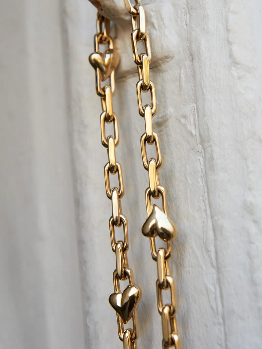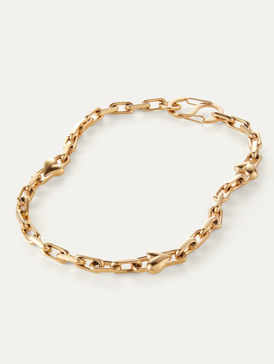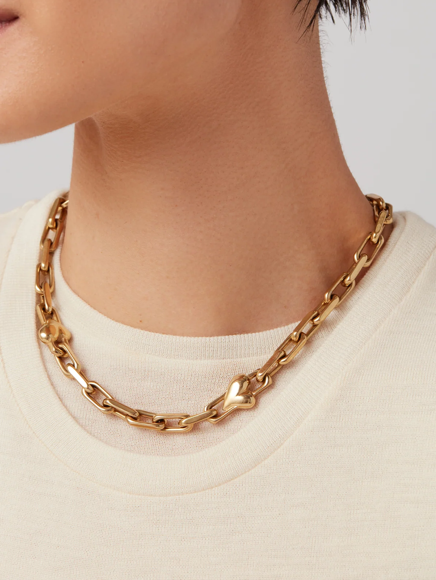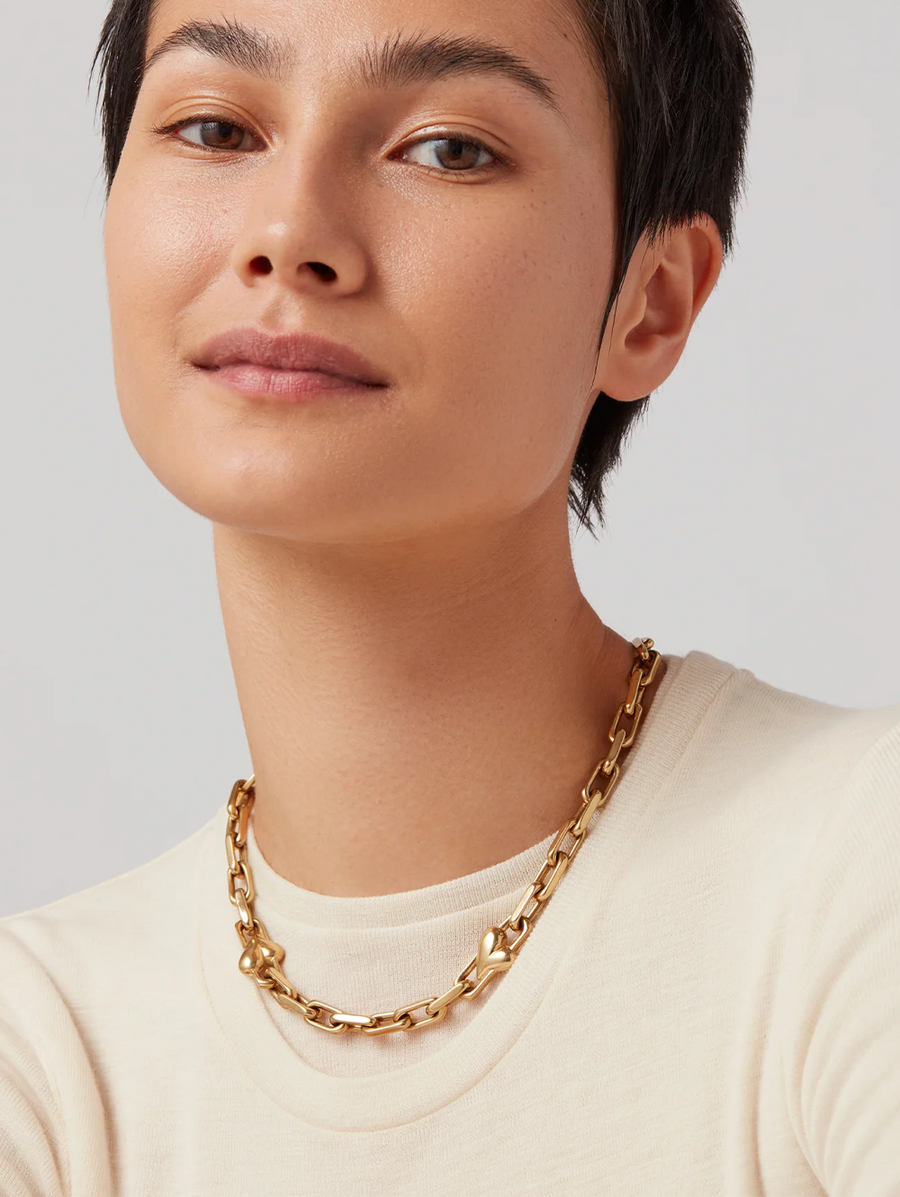 Amy Says... Crisp, faceted links are punctuated with small voluminous hearts. Wear the oversized S-clasp at the front for an alternate look. Versatile and elegant, this piece works well for layering with other necklaces and suits both casual and dressy outfits. We love this piece for its comfortable fit; get ready to receive compliments when wearing it. Finished in high-polish gold. Shop Jewelry.