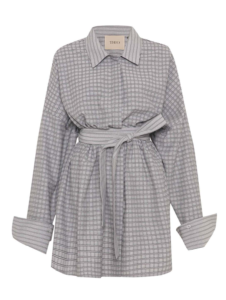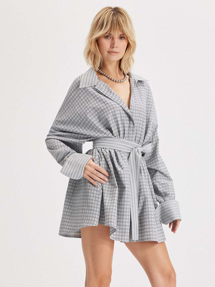 Amy Says... A fresh take on the classic shirtdress, the Echo Fit-and-Flare Mini blends menswear texture with a sculpted feminine shape. Cut from lightweight yarn-dyed stretch plaid with subtle sheen, it features a hidden front placket, soft flared skirt, and exaggerated sleeves that bring drama to the everyday. The wide self belt cinches the waist for definition, while hidden side zip pockets add function. Style it solo with boots or layered over slim pants for a modern twist. Shop Dresses.