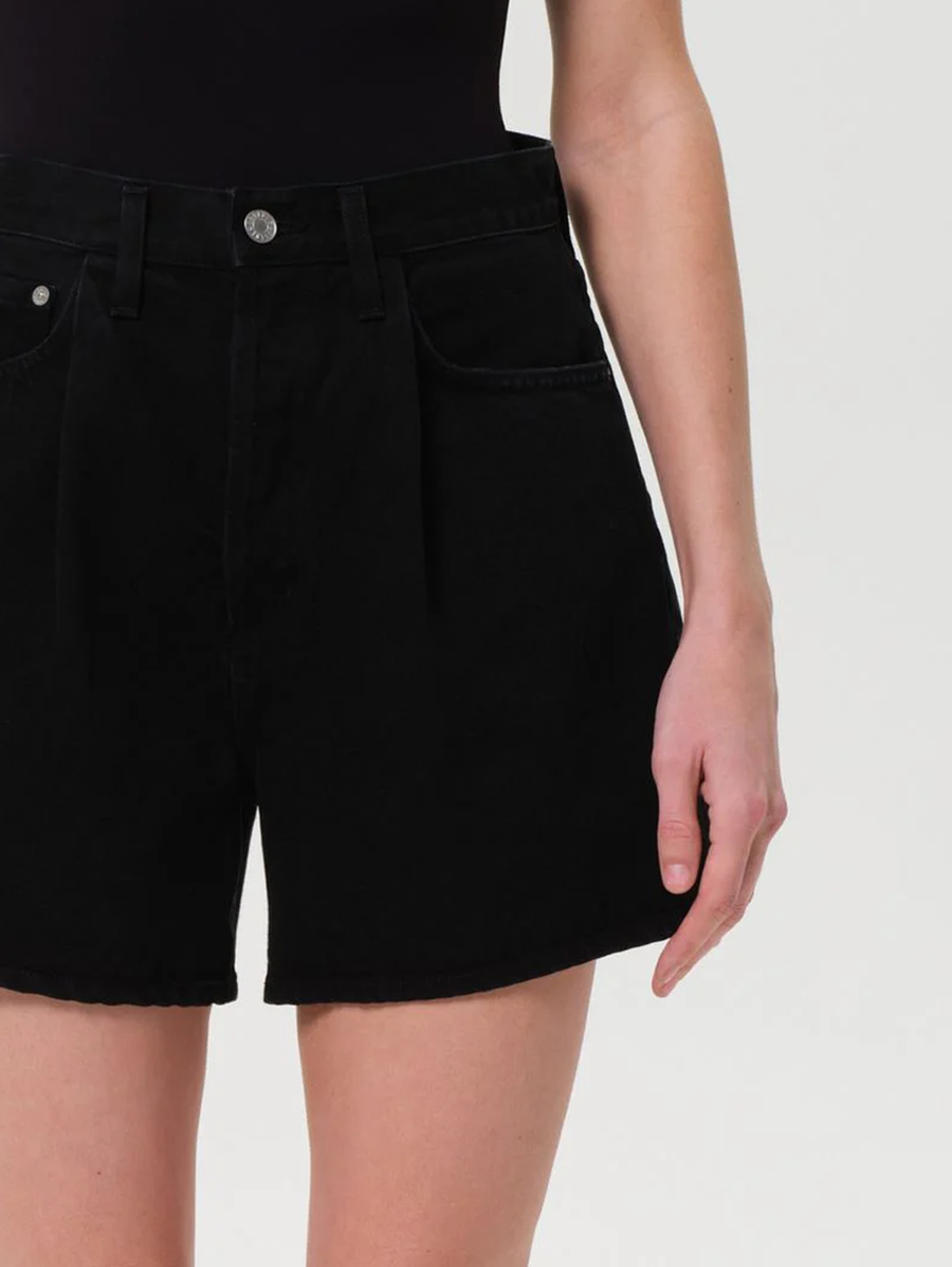 Amy Says... The Rhoda Short features a relaxed fit with a high-rise waist and a softly structured A-line silhouette. Designed in a flat marbled black denim, the refined pleat detailing adds subtle dimension and elevates the clean, streamlined shape. Crafted from a rigid non stretch cotton blend, it offers a soft hand feel and all-day wearability while maintaining its crisp structure. Pair it with a tucked-in tank or an airy button-down for an effortlessly elevated warm-weather look. Looks Like: Flat marbled black denim short with pleat front detailing. Feels Like: Rigid, non stretch denim cotton blend made with a soft hand feel. This fit is true to size. Shop Shorts.